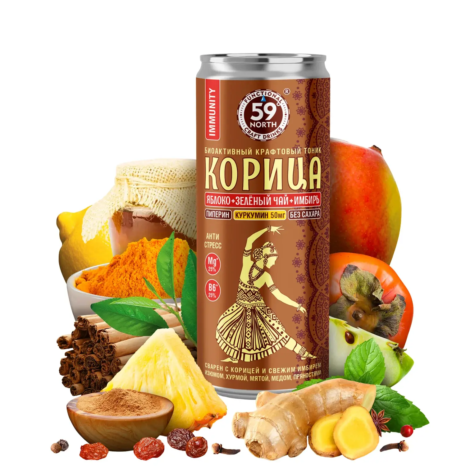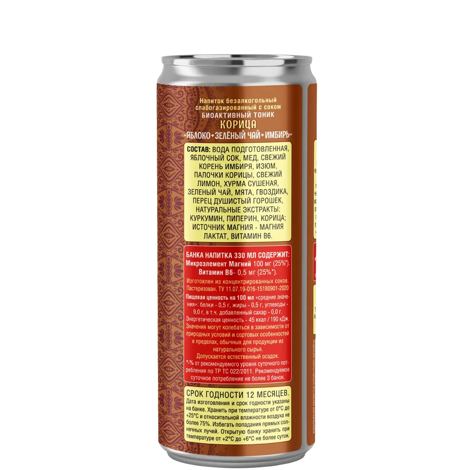 Биоактивный тоник на основе мёда, зелёного чая, свежего имбиря и палочек корицы с яблочным соком, изюмом и сушёной хурмой. С натуральными экстрактами корицы, куркумина и пиперина, источником магния и витамином B6. Пряный функциональный напиток без добавленного сахара — для иммунитета, тёплого внутреннего комфорта и ЗОЖ, 45 ккал на 100 мл, объём 330 мл.
