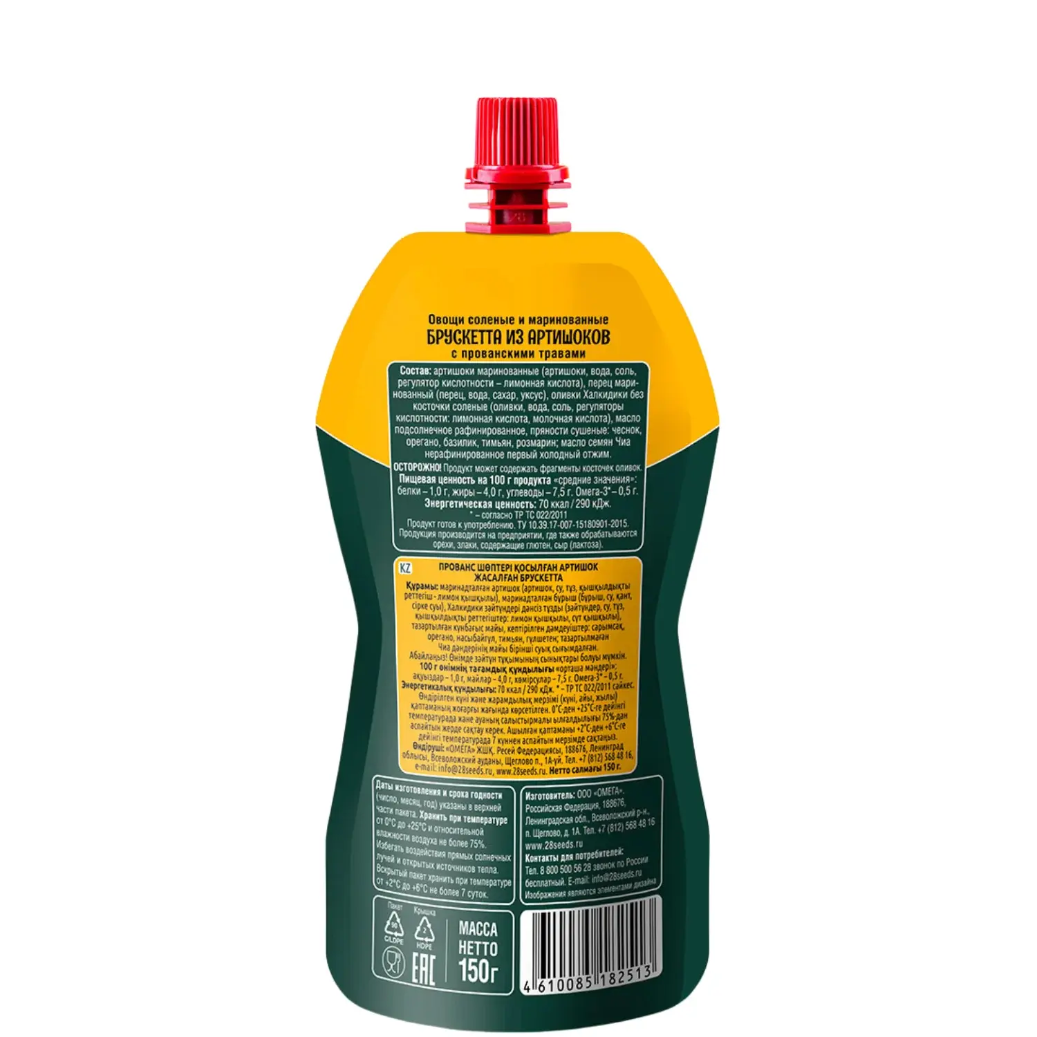 Овощная брускетта из маринованных артишоков с оливками Халкидики, перцем и пряными прованскими травами. В подсолнечном масле с добавлением масла семян чиа холодного отжима — природного источника Омега-3. Готовая намазка для тостов, брускетты, пасты и салатов, масса нетто 150 г.