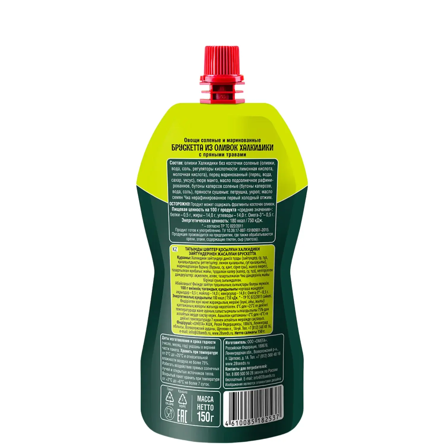 Оливковая брускетта на основе оливок Халкидики без косточки с маринованным перцем, каперсами, пюре манго и зеленью. В подсолнечном масле с маслом семян чиа холодного отжима. Средиземноморская паста для тостов, закусок к вину, пасты и салатов, масса нетто 150 г.