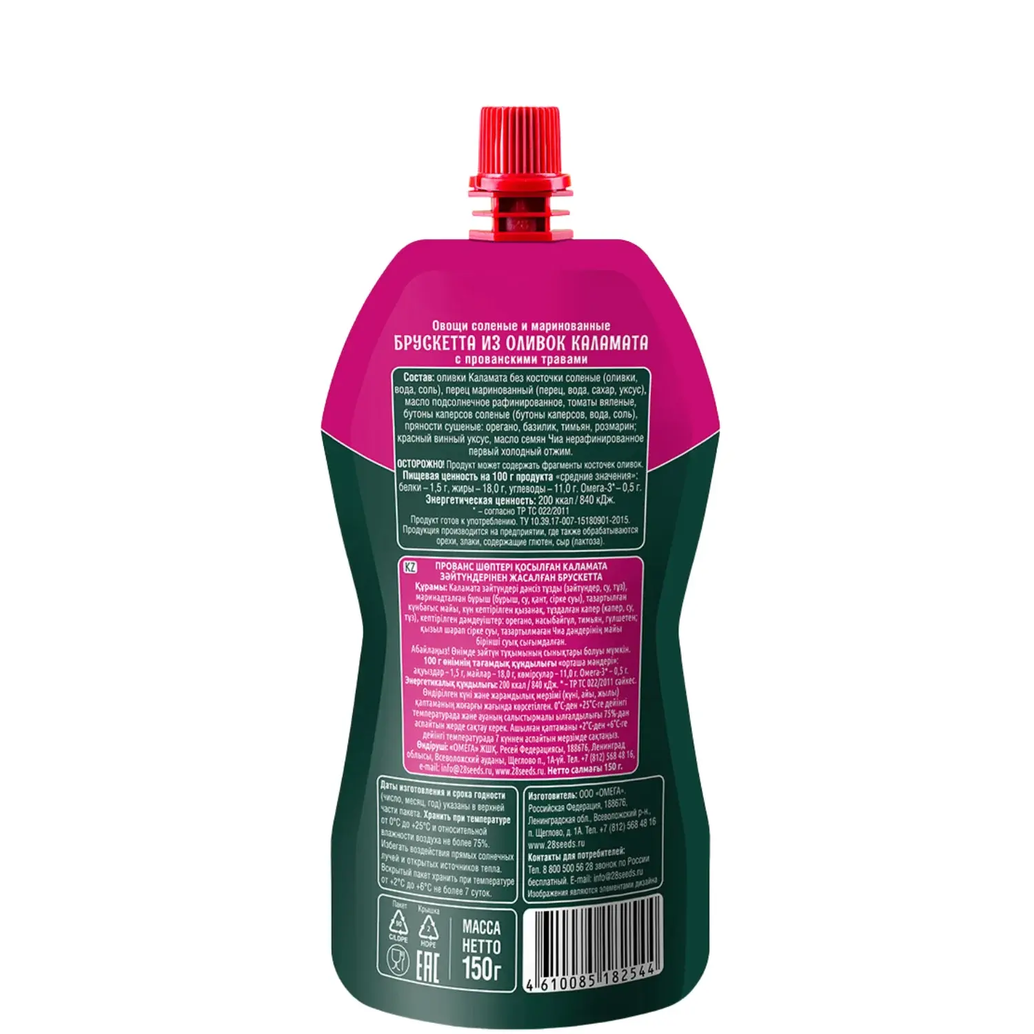 Оливковая брускетта на основе оливок Каламата без косточки с вялеными томатами, маринованным перцем, каперсами и прованскими травами. В подсолнечном масле с красным винным уксусом и маслом семян чиа холодного отжима. Насыщенная паста для тостов, закусок и средиземноморских блюд, 150 г.