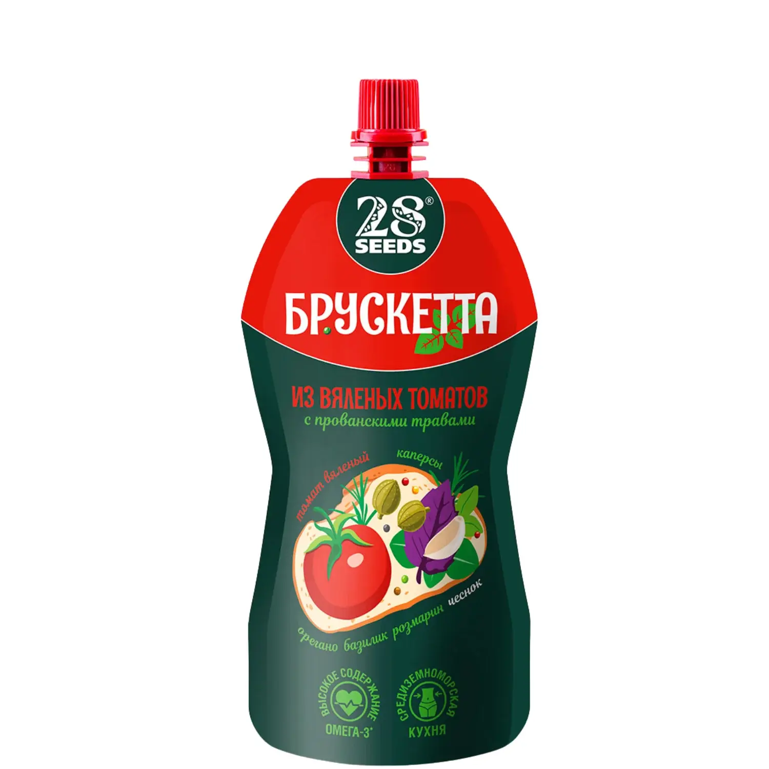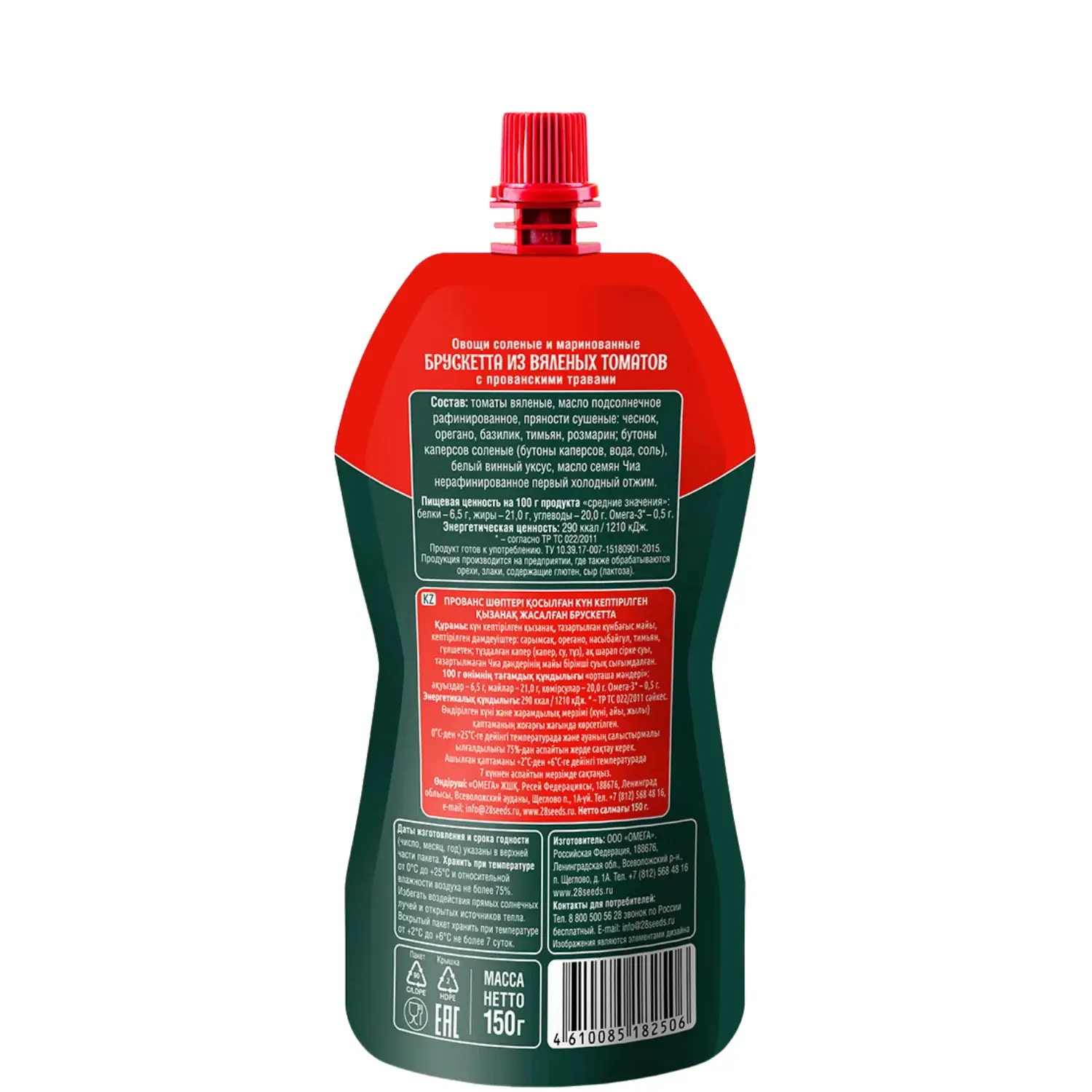 Средиземноморская брускетта из вяленых на солнце томатов с прованскими травами и бутонами каперсов, в подсолнечном масле с добавлением масла семян чиа холодного отжима. Ароматная овощная намазка с высоким содержанием Омега-3, белка и клетчатки — для тостов, брускетты, пасты, салатов и мясных/рыбных блюд. Удобный дой-пак 150 г, продукт без консервантов и усилителей вкуса.