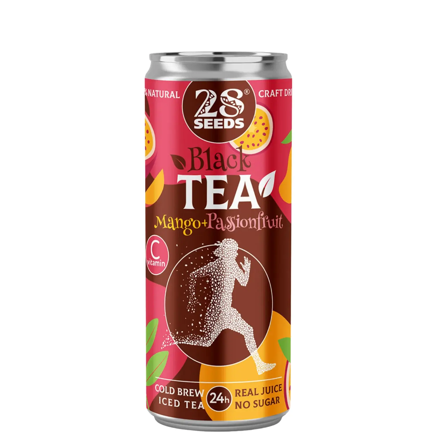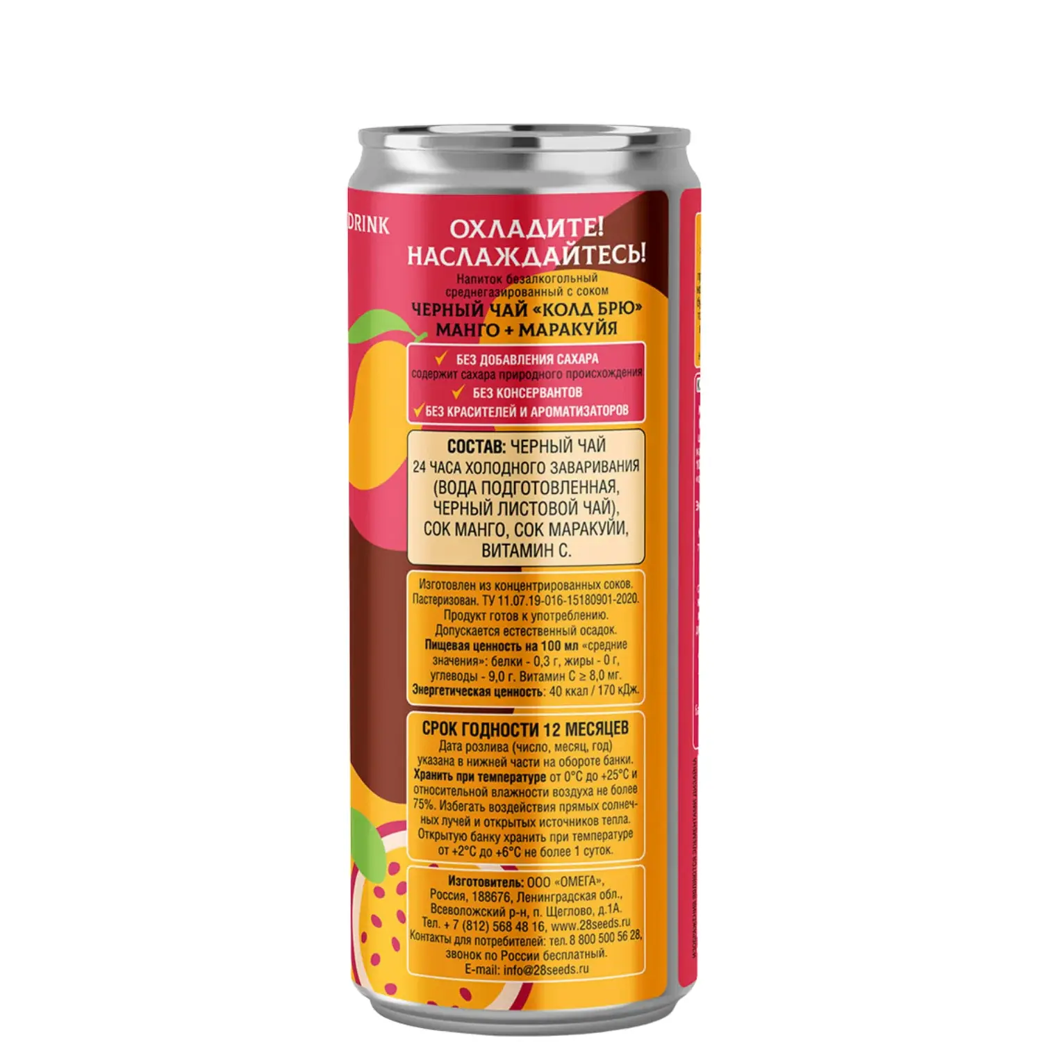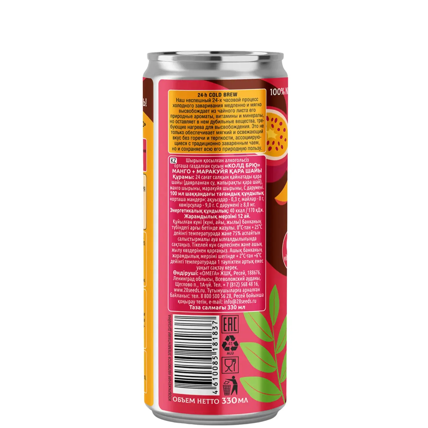 Легко газированный черный чай cold brew с натуральными соками манго и маракуйи. Яркий тропический вкус, 24-часовое холодное заваривание, витамин C, 40 ккал на 100 мл. Без добавленного сахара, в банке 330 мл — для ЗОЖ, спорта и отдыха.