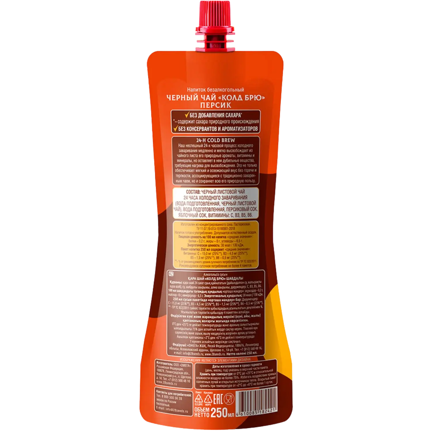 Холодный черный чай, настоянный 24 часа по технологии cold brew, с натуральным персиковым и яблочным соком. Негазированный напиток без добавленного сахара, красителей и консервантов, с витаминами C, B3, B5, B6. Идеален для ЗОЖ, обеденного стола, офиса и перекуса в дороге.