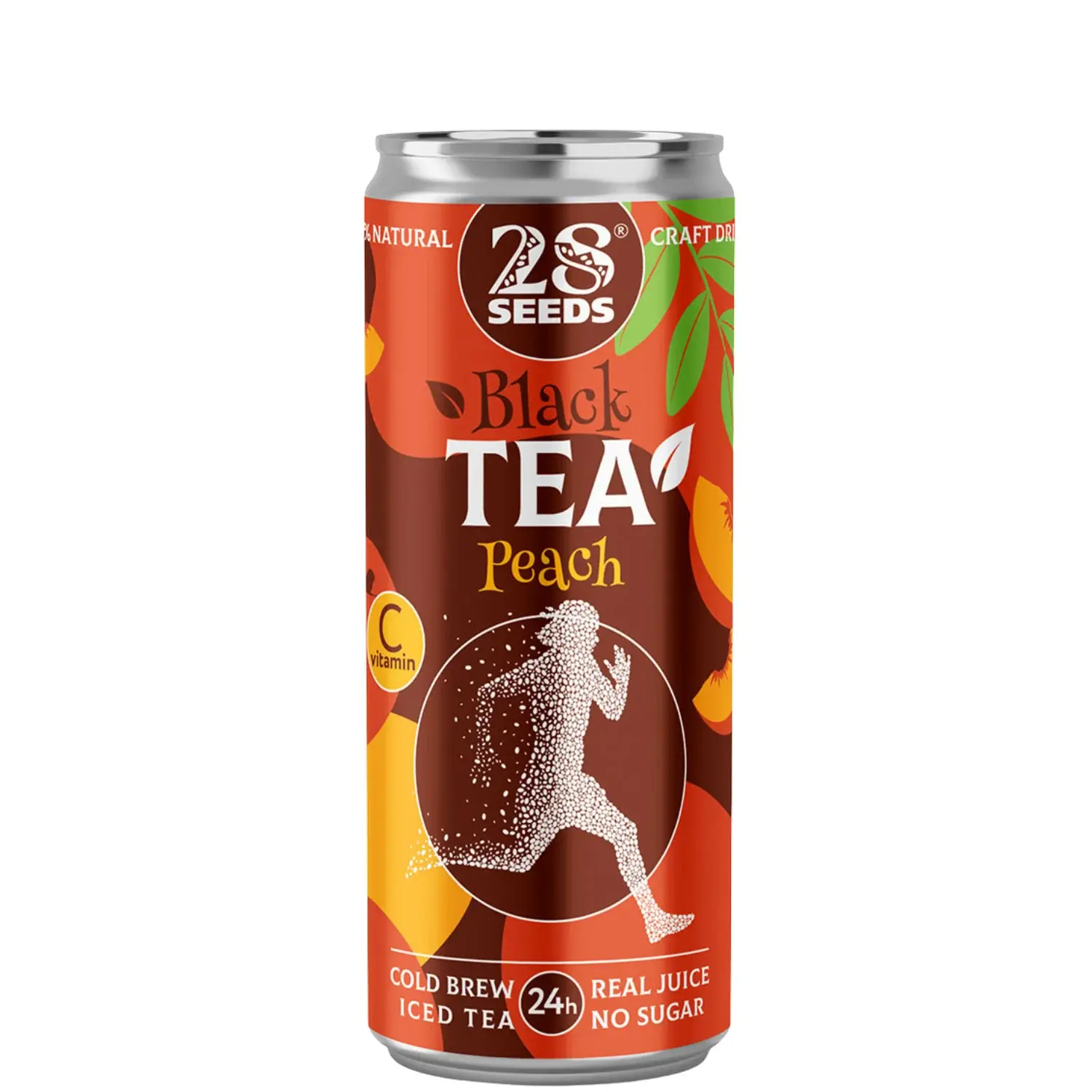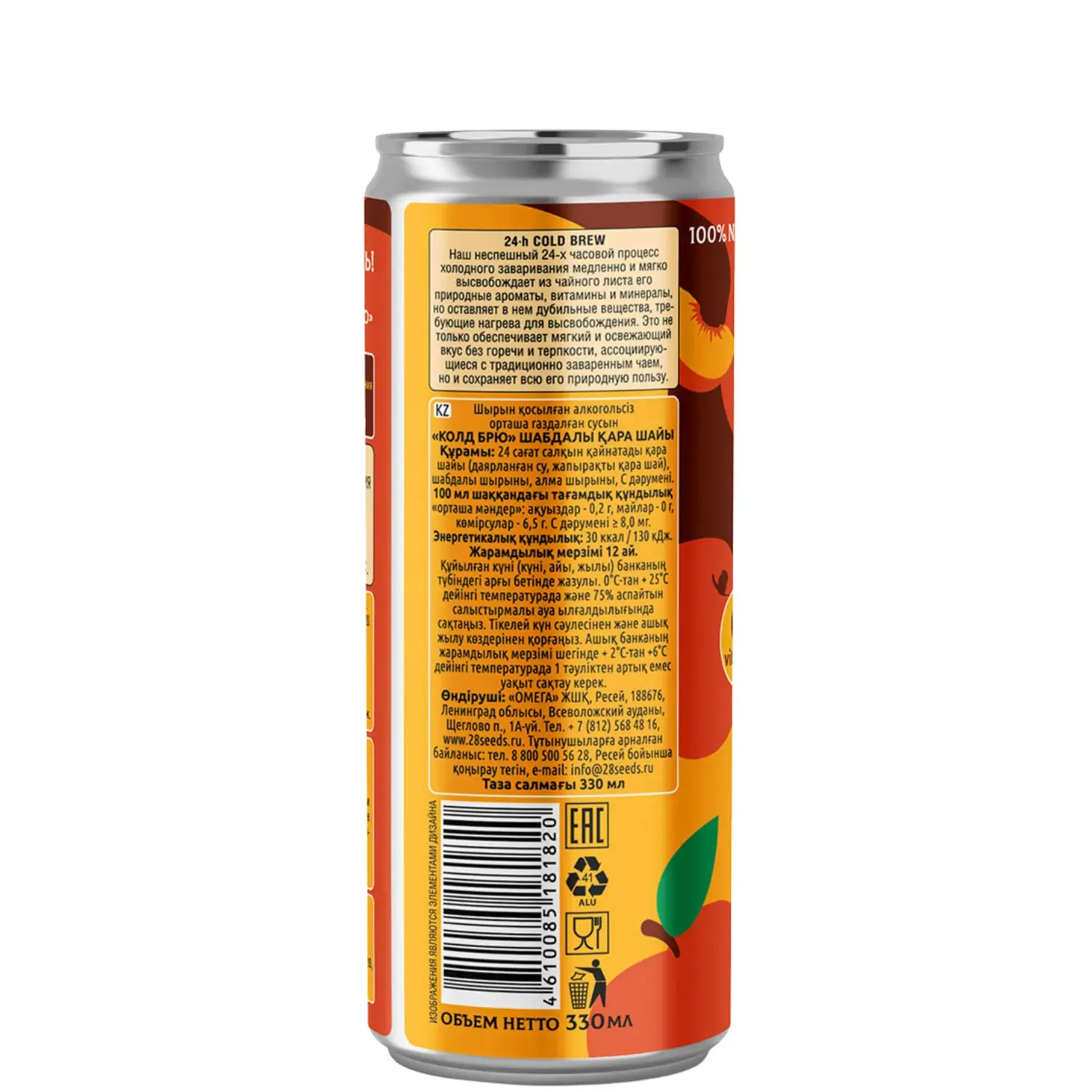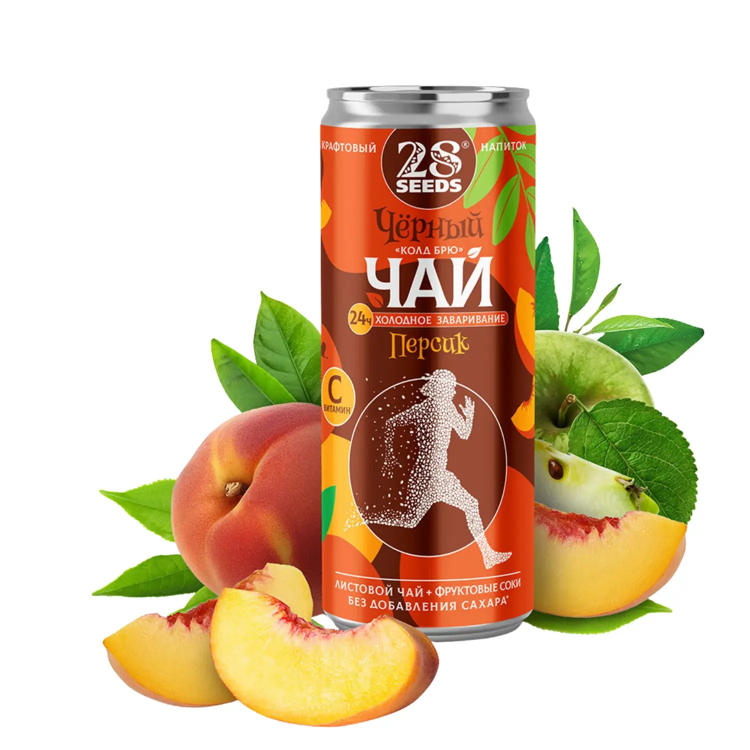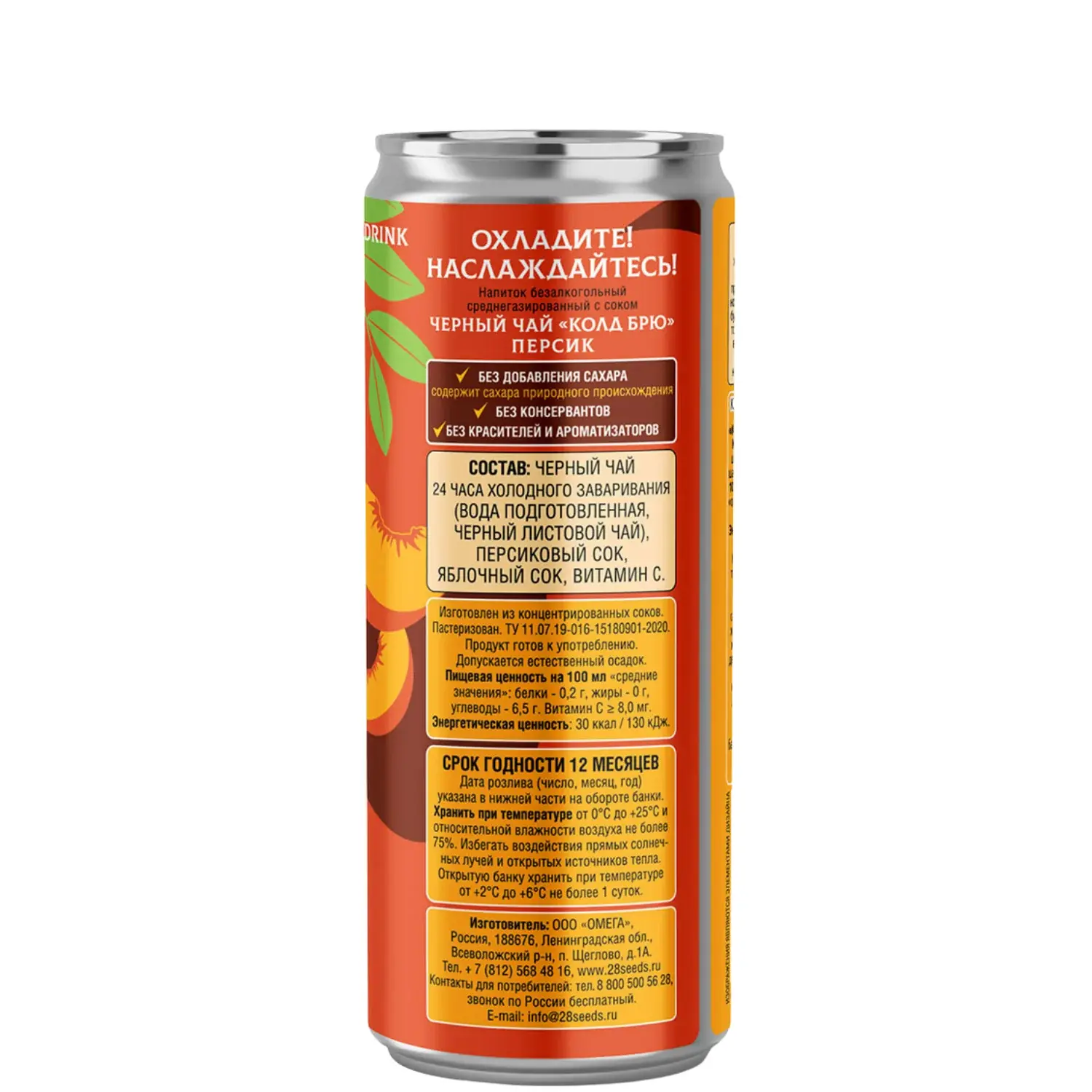 Легко газированный черный чай, настоянный 24 часа по технологии cold brew, с натуральным персиковым и яблочным соками. Освежающий чайный напиток без добавленного сахара, с витамином C, 30 ккал на 100 мл, в удобной банке 330 мл — для ЗОЖ, обеда, офиса и поездок.