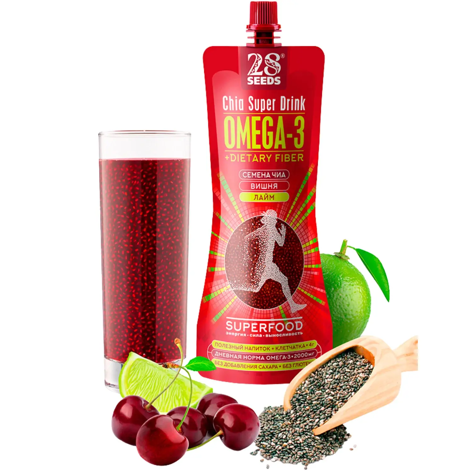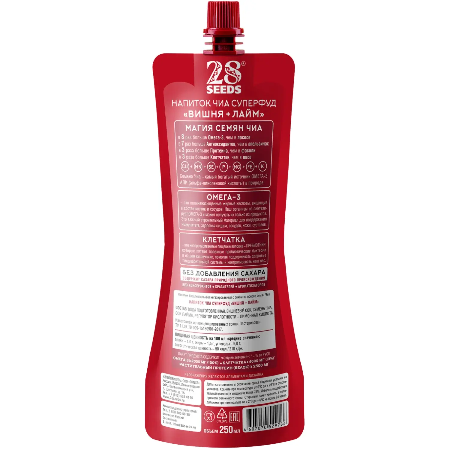 Натуральный функциональный напиток Чиа СУПЕРФУД «Вишня + Лайм» 250 мл без сахара. Семена чиа, вишнёвый сок и сок лайма — яркий вкус, суперфуды и природные антиоксиданты для активного дня.