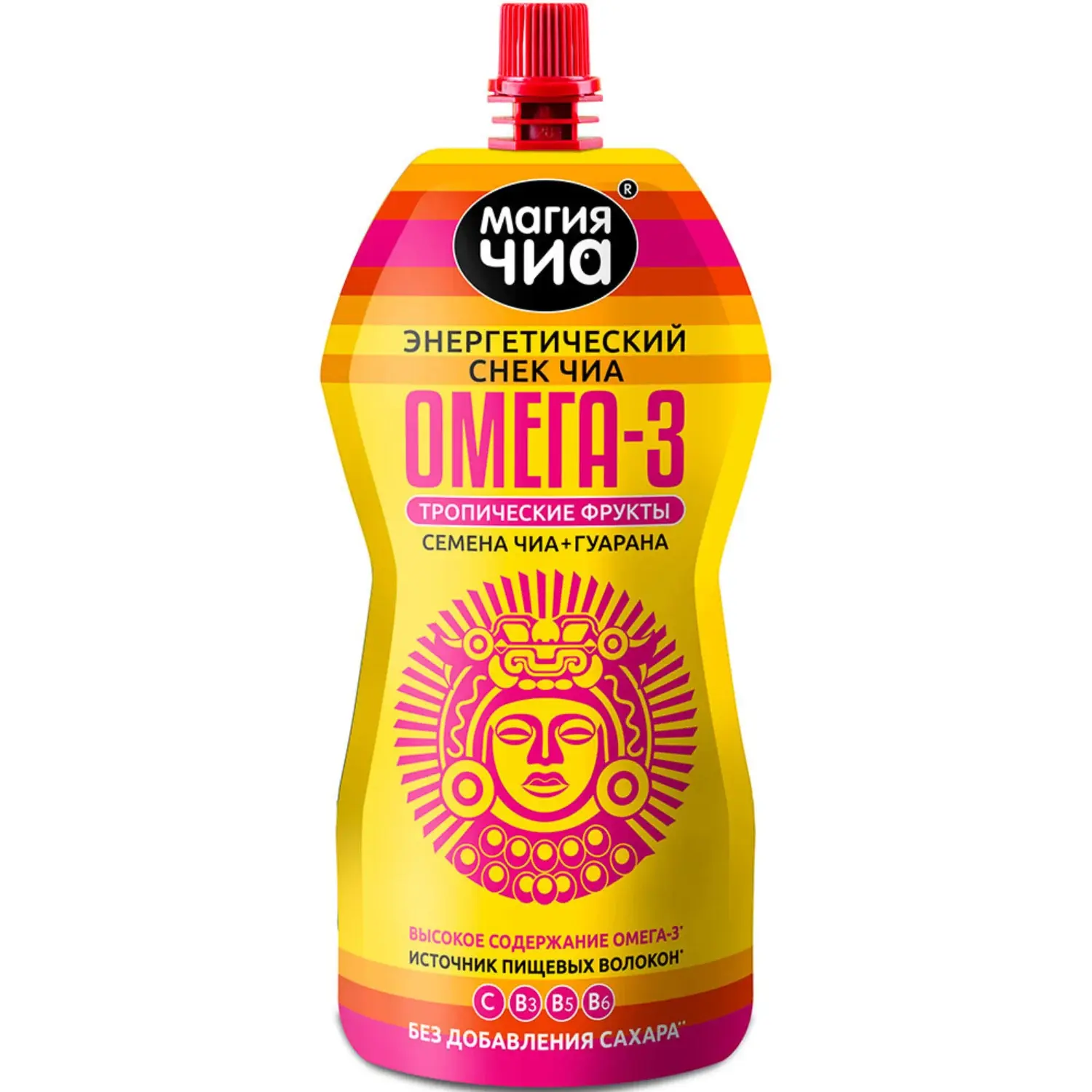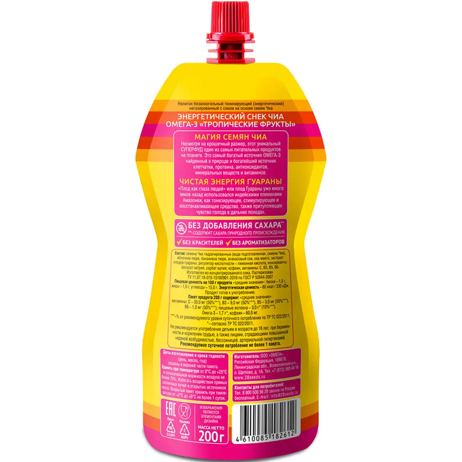 Негазированный тонизирующий напиток-снек на основе гидратированных семян чиа с яблочным и банановым пюре, соками ананаса и манго. Источник растительной Омега-3, гуараны и кофеина, витаминов C, B3, B5, B6 и пищевых волокон. 80 ккал на 100 г. Пакет 200 г — тропический энергетический перекус для активного дня, работы, учёбы и спорта.