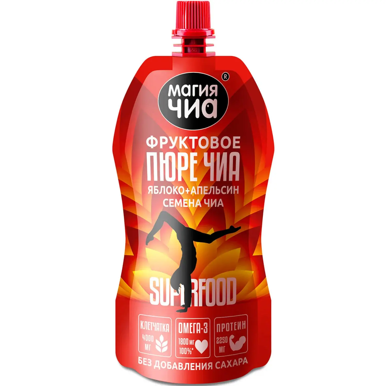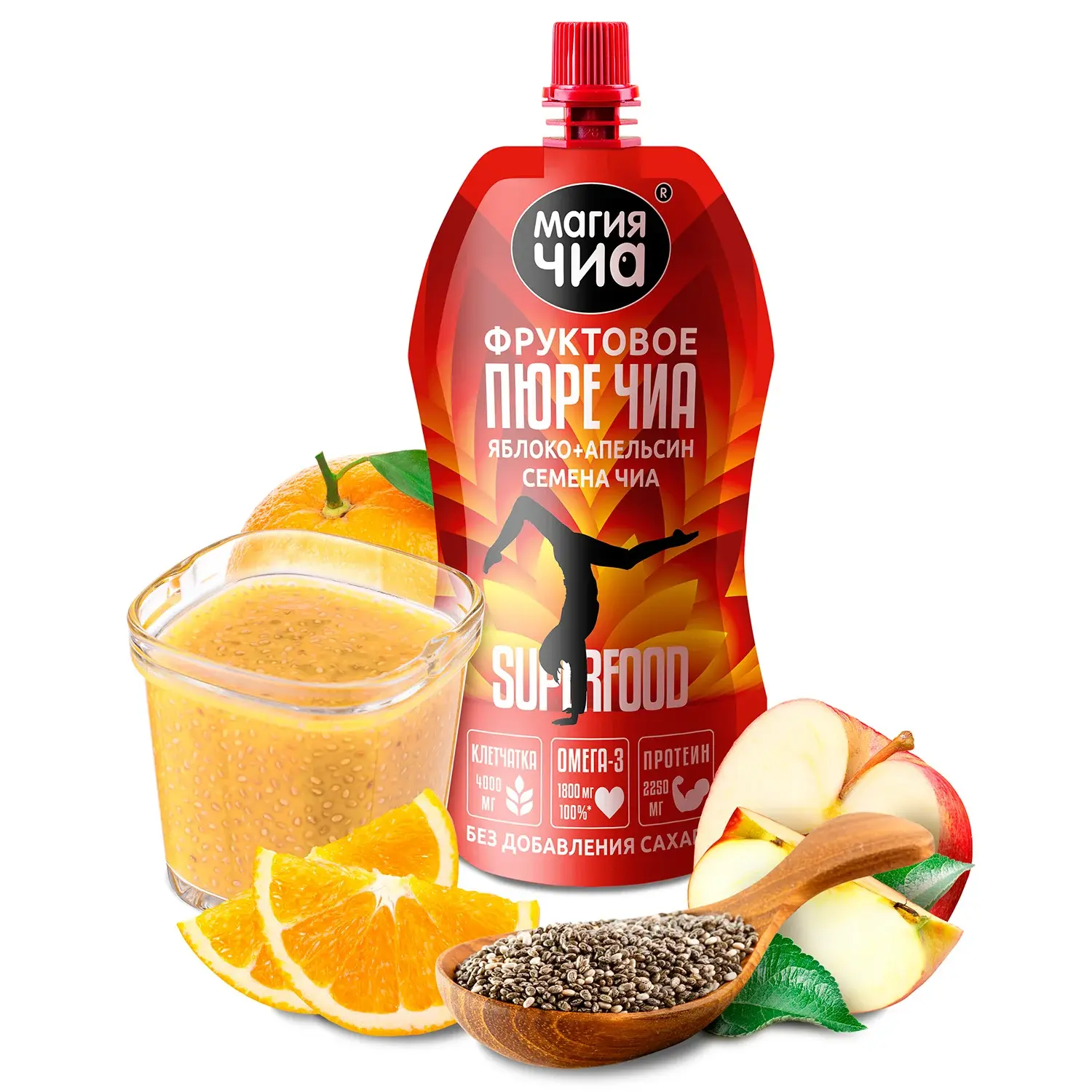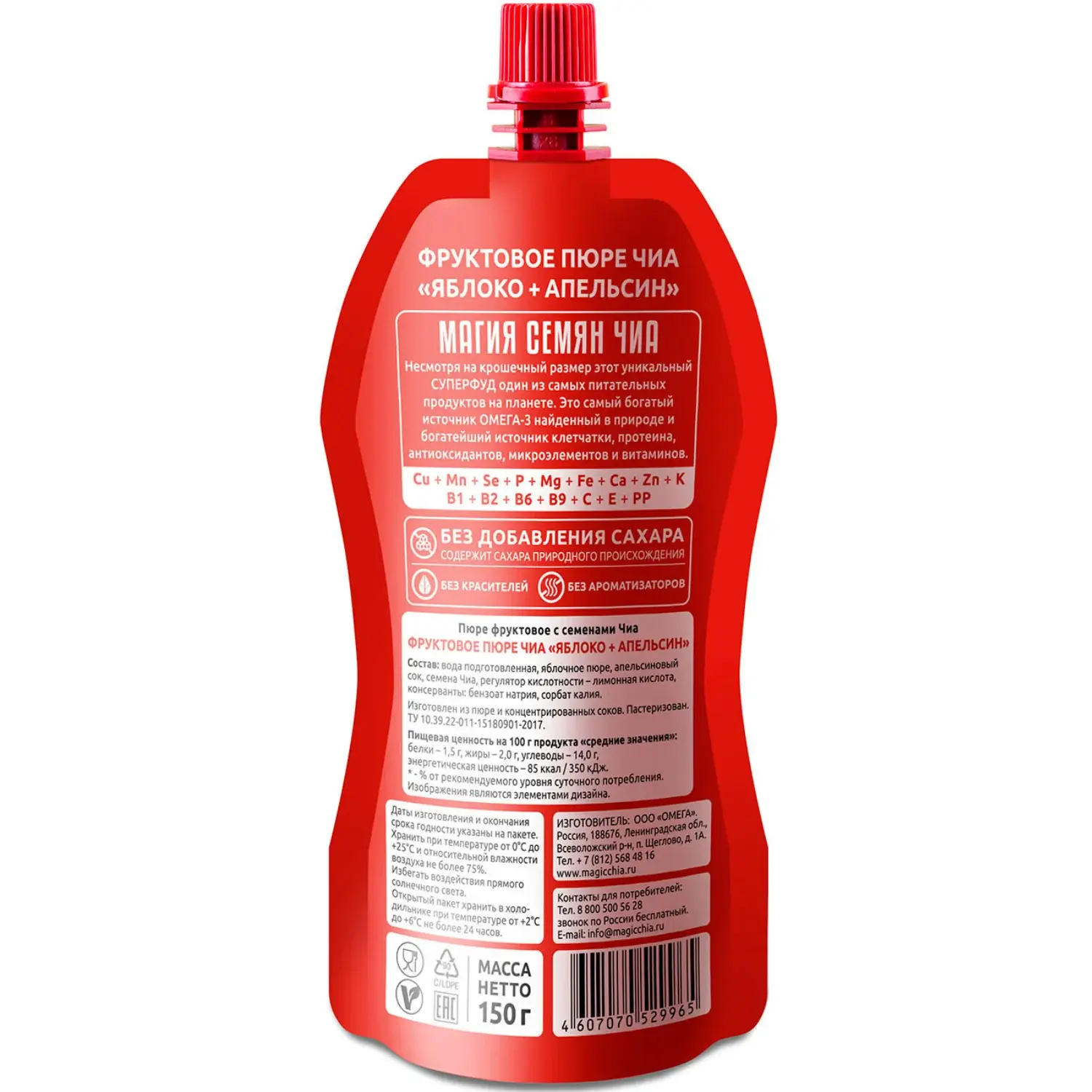 Густое фруктовое пюре на основе яблочного пюре и апельсинового сока с добавлением семян чиа. Негазированный десерт с мягким вкусом спелого яблока и яркой цитрусовой нотой. Источник растительной Омега-3 и пищевых волокон, 85 ккал на 100 г. Удобный формат 150 г — готовый перекус для детей и взрослых дома, в школе, на работе и в дороге.
