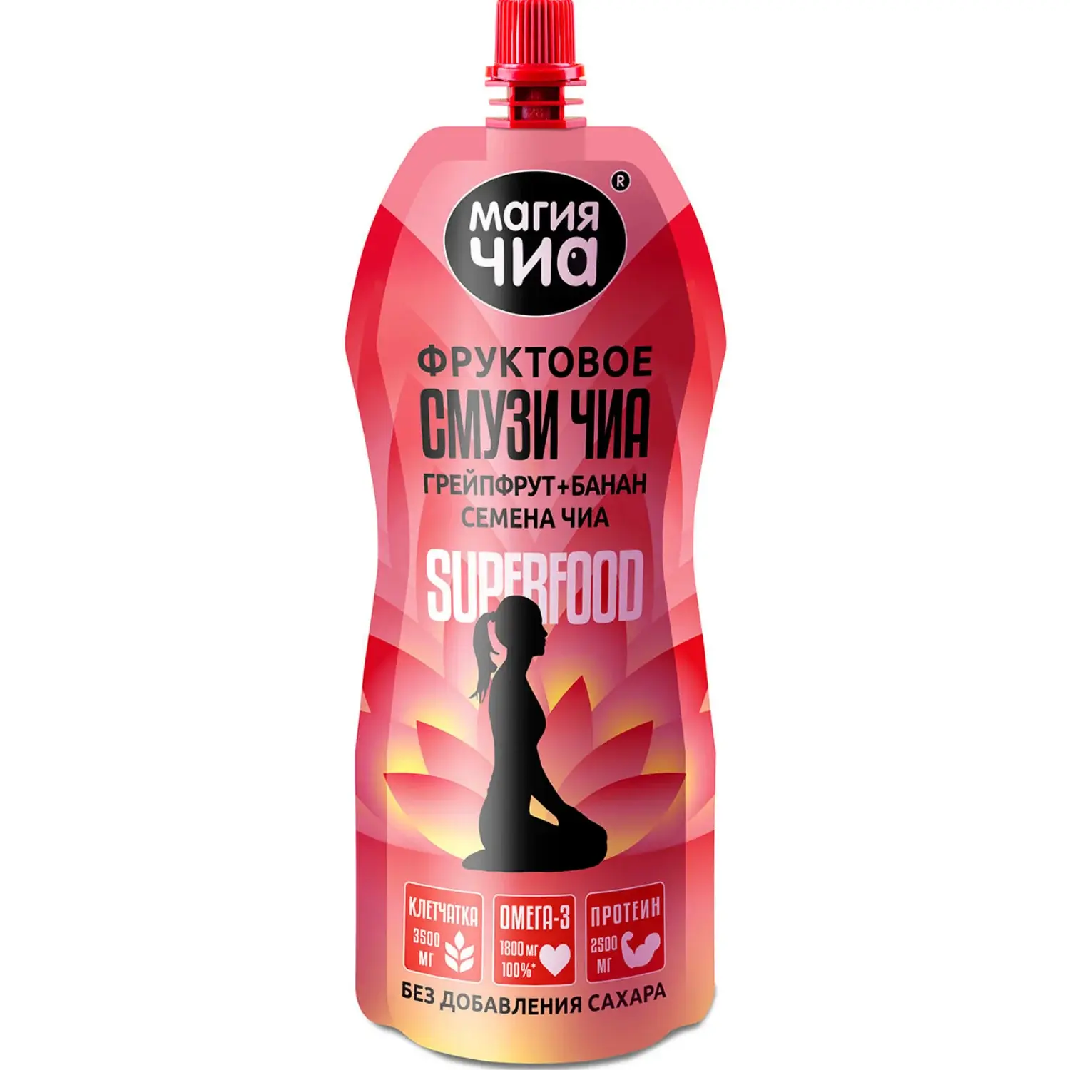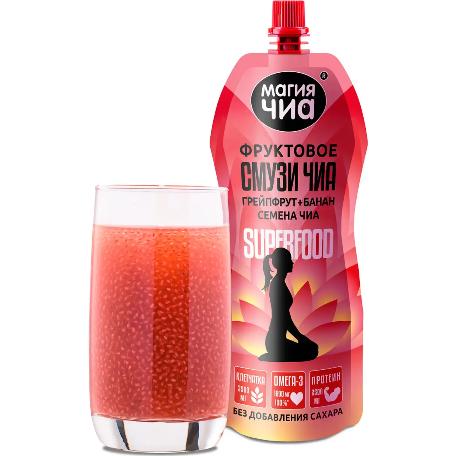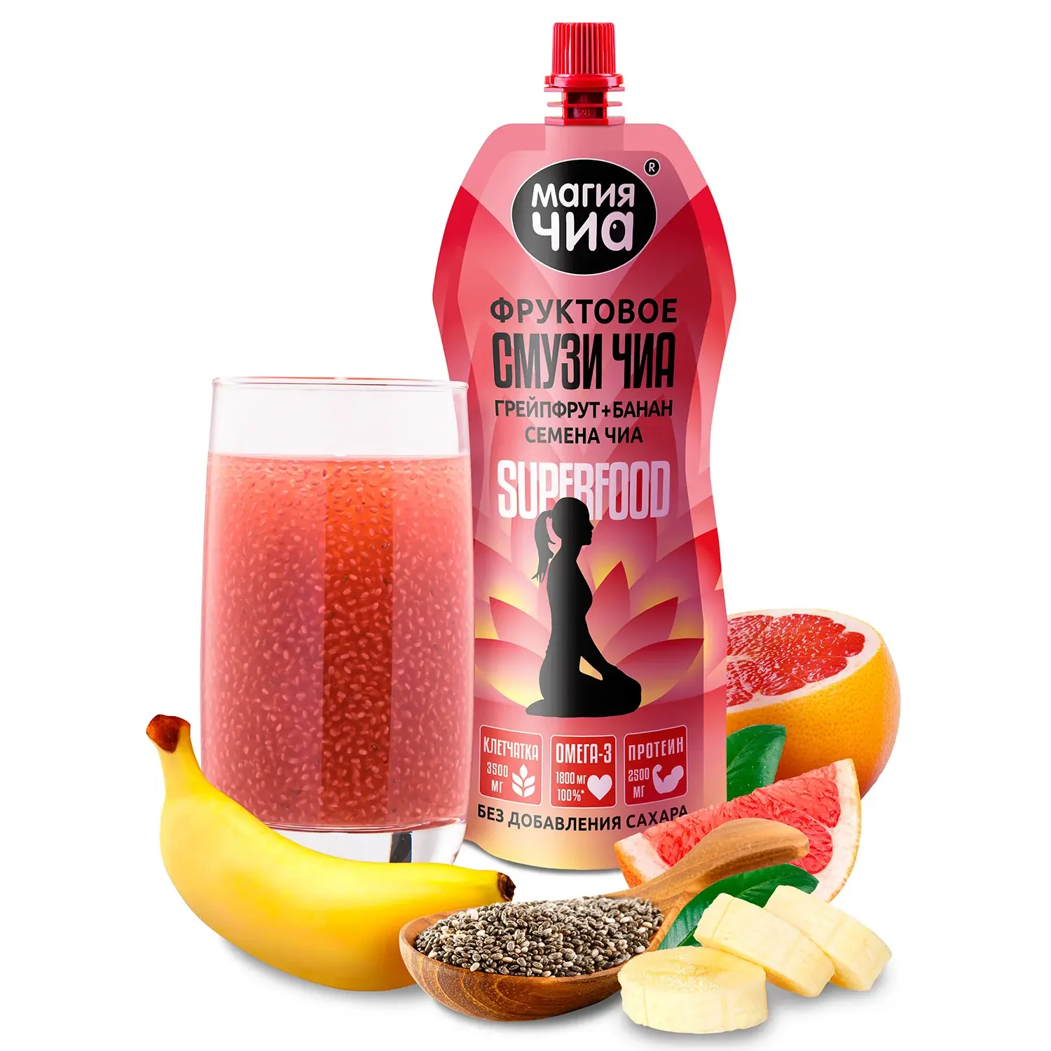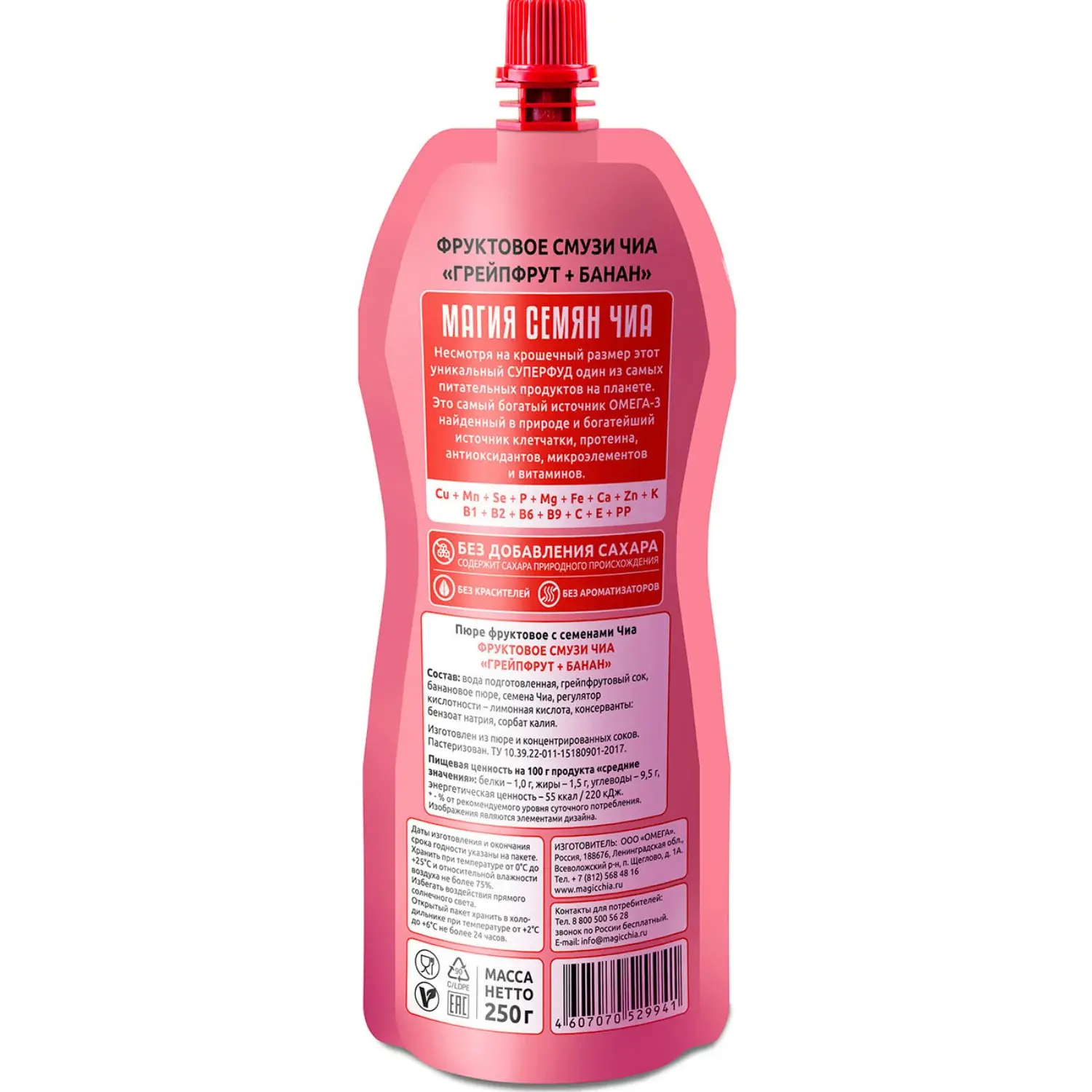 Фруктовое смузи на основе грейпфрутового сока и бананового пюре с добавлением семян чиа. Негазированный густой напиток-десерт с лёгкой цитрусовой кислинкой и мягкой банановой сладостью. Источник растительной Омега-3 и пищевых волокон, 55 ккал на 100 г. Удобный формат 250 г — готовый перекус для работы, учёбы и прогулок.