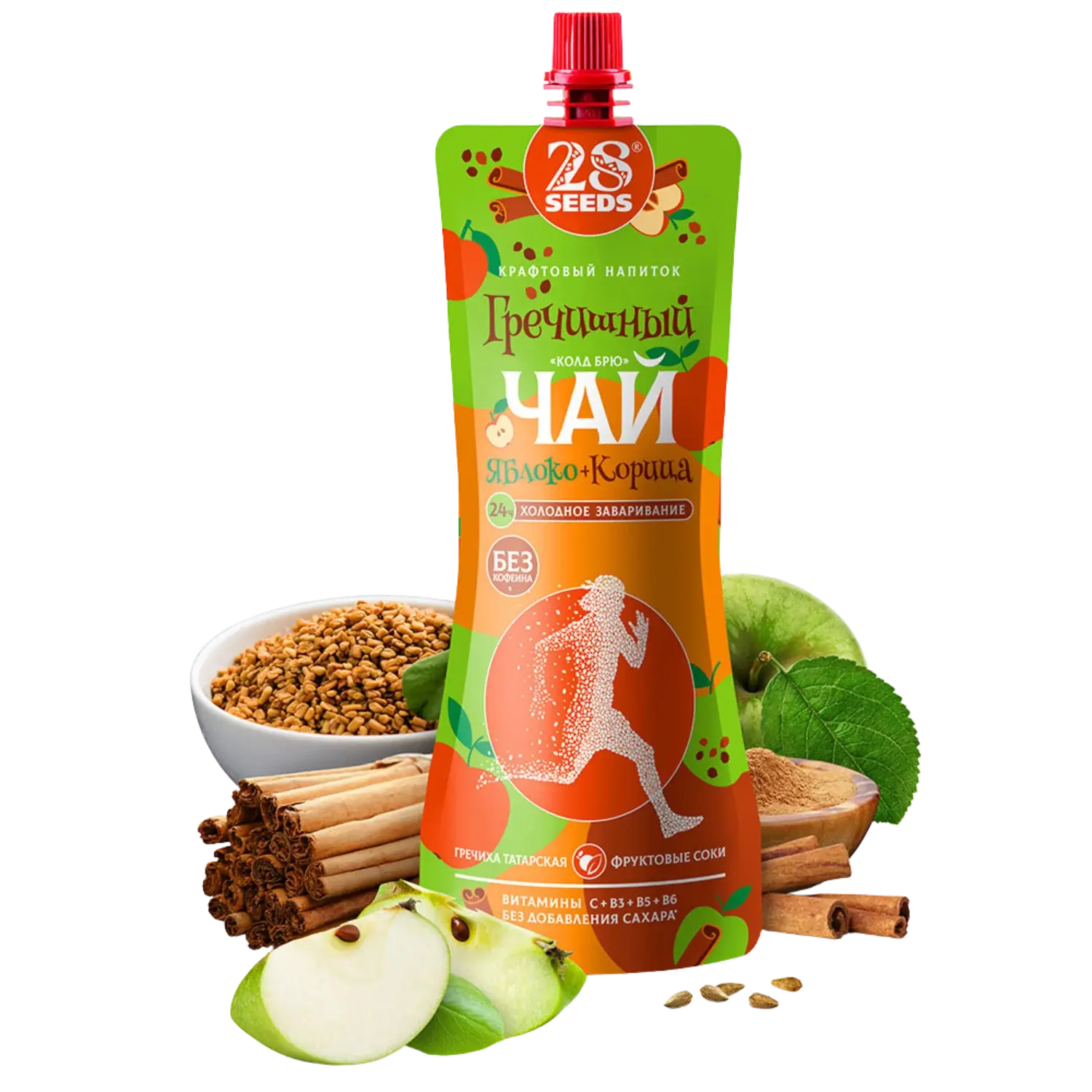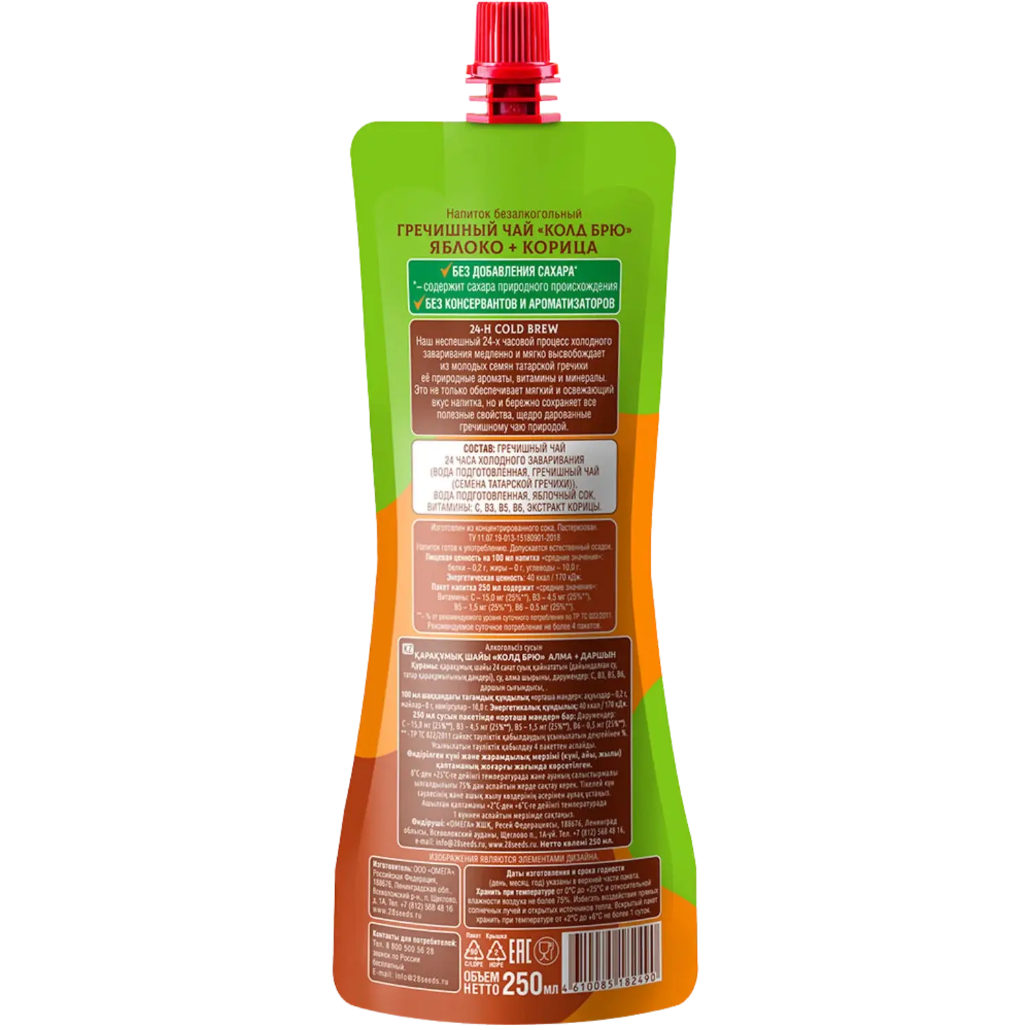 Холодный гречишный чай из семян татарской гречихи, настоянный 24 часа по технологии cold brew, с яблочным соком и экстрактом корицы. Негазированный напиток без добавленного сахара, с витаминами C, B3, B5, B6. Теплый яблочно-пряный вкус для ЗОЖ, обеденного стола и уютного перерыва в течение дня.