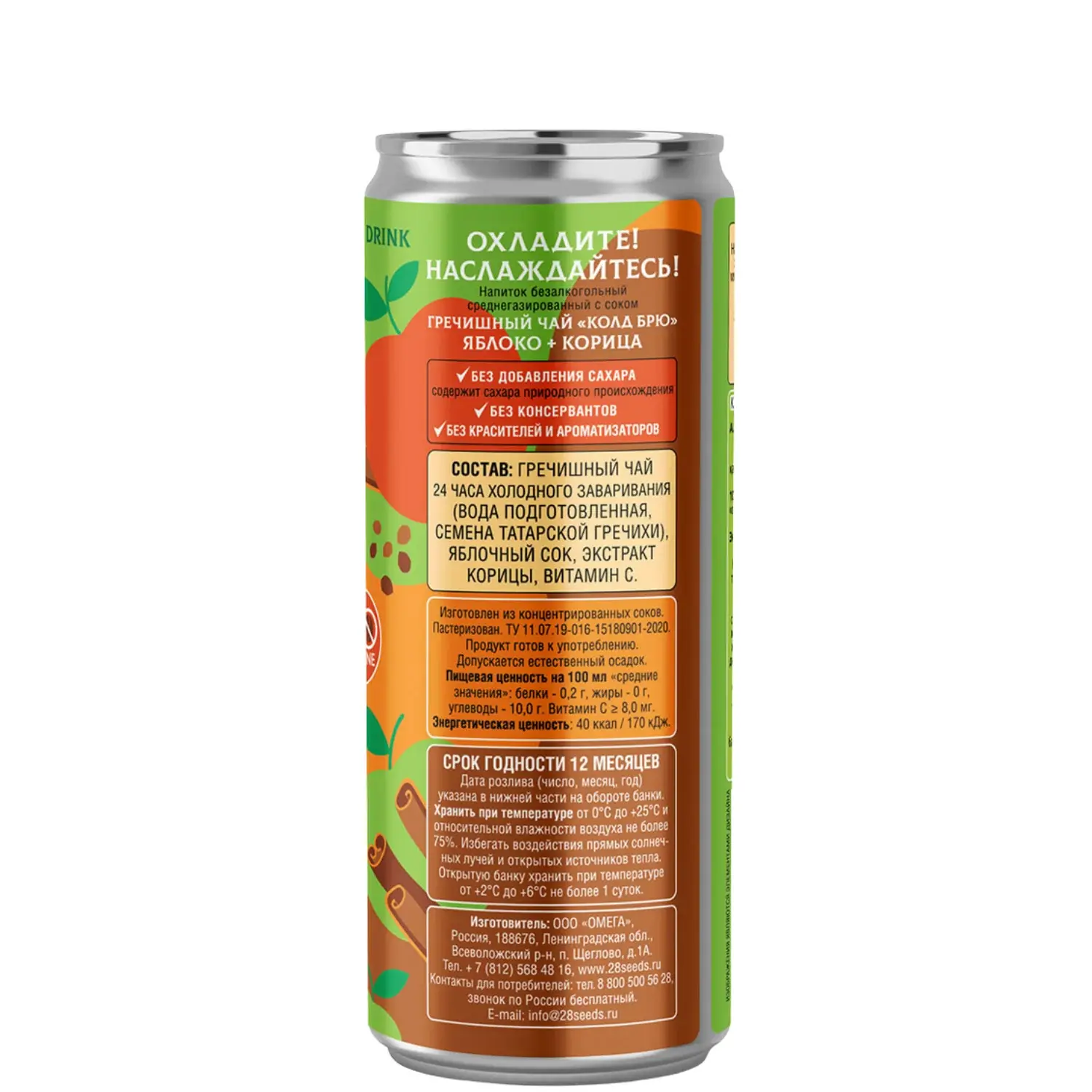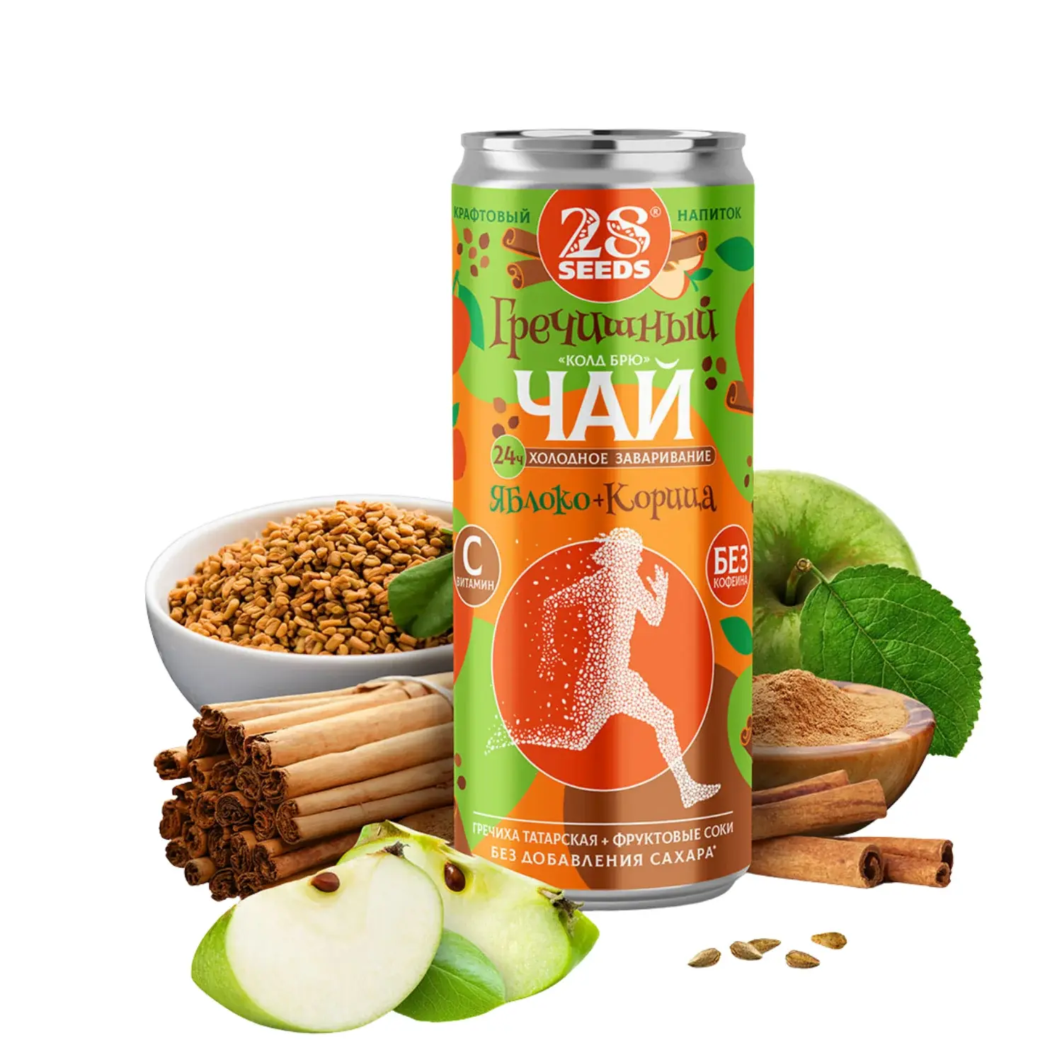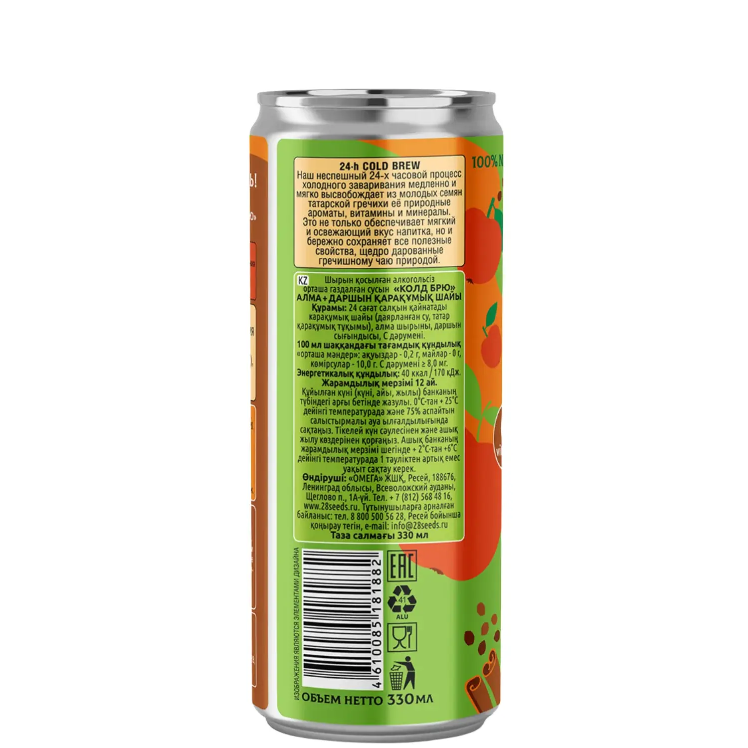 Легко газированный гречишный чай, настоянный 24 часа по технологии cold brew, с яблочным соком и экстрактом корицы. Тёплый яблочно-пряный вкус, витамин C, 40 ккал на 100 мл. Без добавленного сахара, в банке 330 мл — для ЗОЖ и уютного перерыва в течение дня.