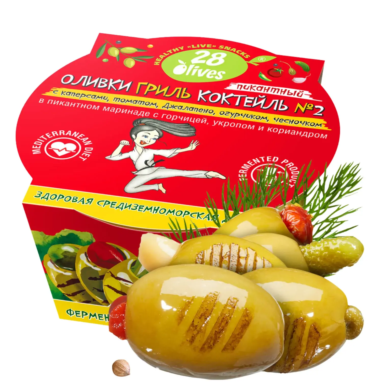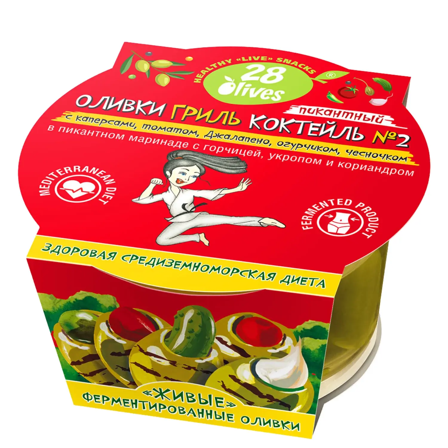 Пикантный оливковый коктейль ГРИЛЬ: оливки Халкидики без косточки, солёный огурчик и чесночок, каперсы, вяленый томат и перец Джалапено в маринаде с горчицей, укропом и кориандром. Яркая закуска к мясу и пиву. Контейнер 150 г (масса продукта 60 г).