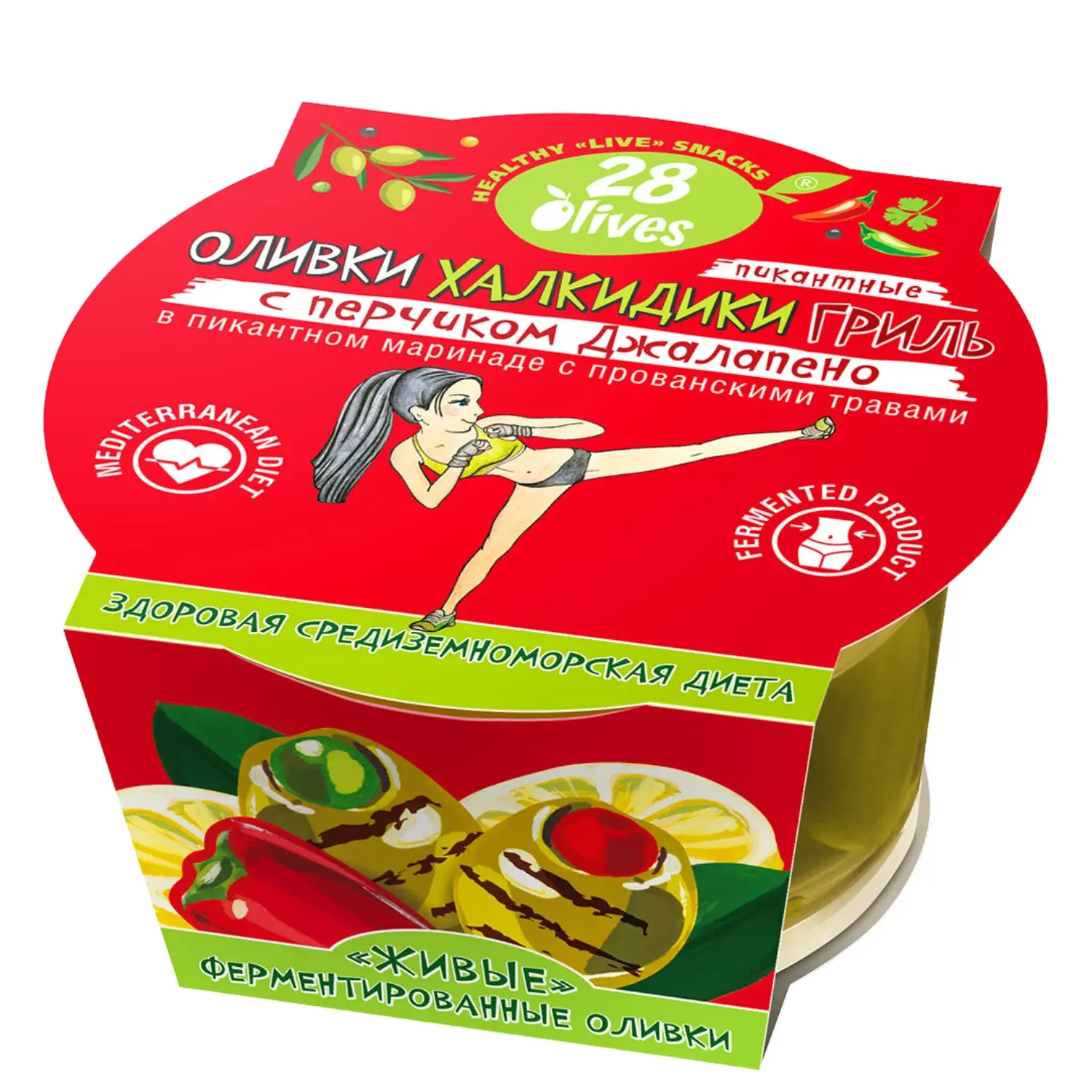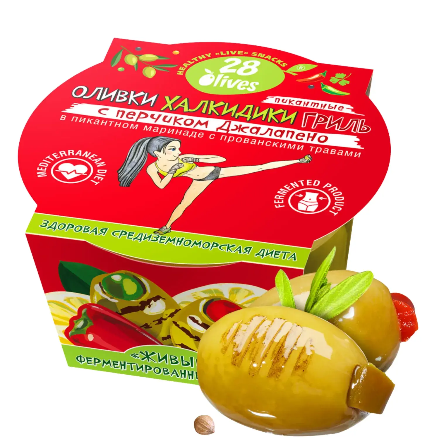 Оливки Халкидики ГРИЛЬ без косточки с маринованным перцем Джалапено в пряном маринаде с прованскими травами. Умеренно острый вкус с лёгким «огоньком». Контейнер 150 г (масса продукта 60 г).