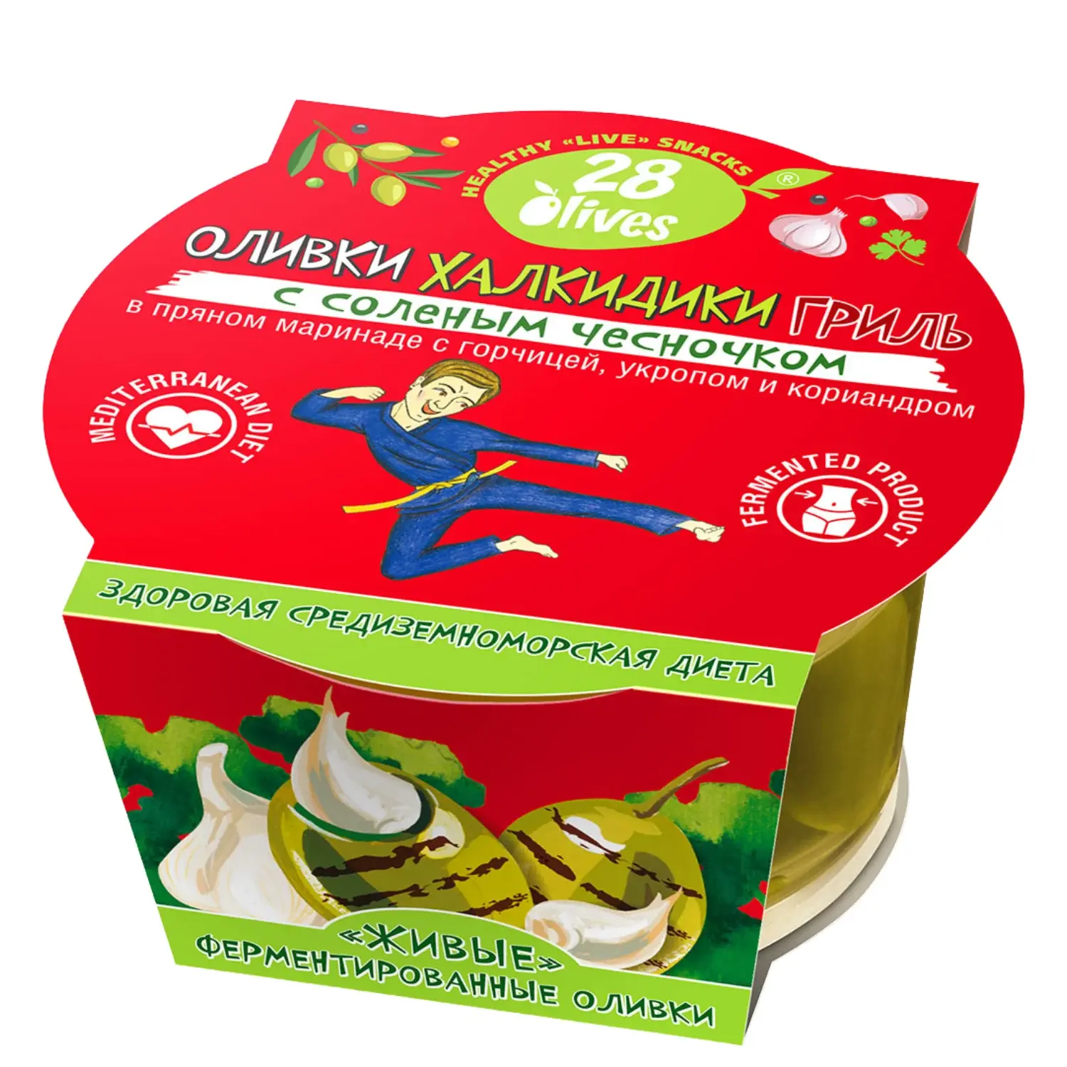 Оливки Халкидики ГРИЛЬ без косточки с солёным чесночком в маринаде с горчицей, укропом и кориандром. Выраженный чесночный вкус для любителей пряных закусок. Контейнер 150 г (масса продукта 60 г).