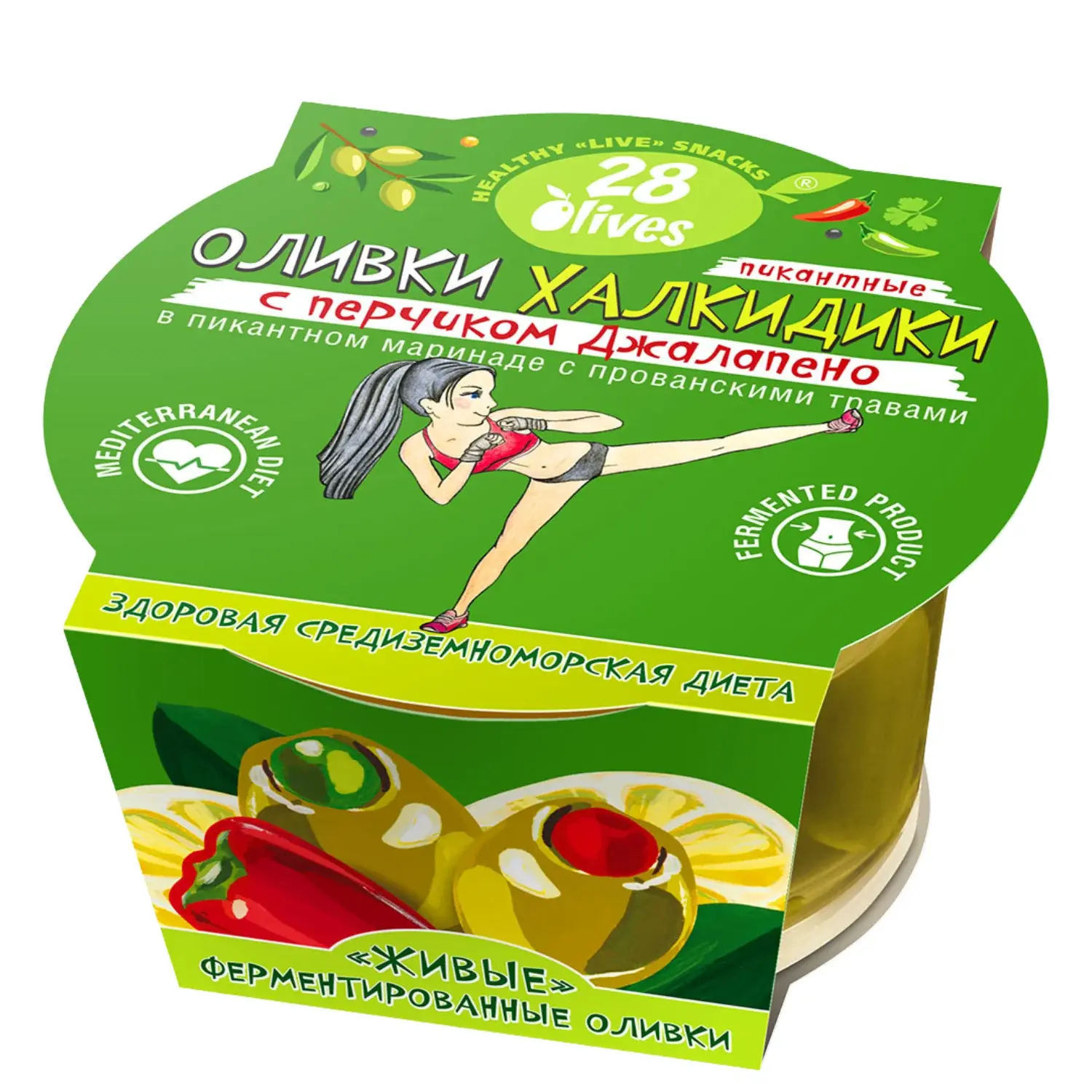 Оливки Халкидики без косточки с маринованным перцем Джалапено в пряном маринаде с прованскими травами. Умеренно острая, ароматная закуска в средиземноморском стиле. Контейнер 150 г (масса продукта 60 г).