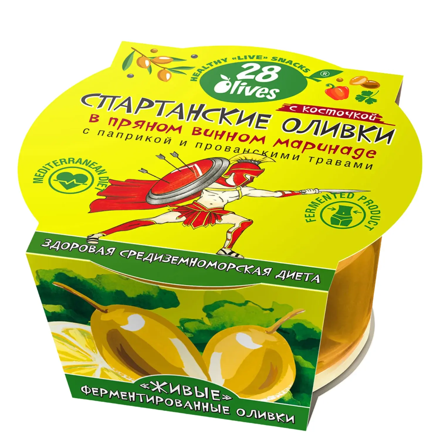 Оливки сорта Золотые (спартанские) с косточкой в красном винном маринаде с паприкой и прованскими травами. Плотные, маслянистые оливки с насыщенным вкусом. Контейнер 150 г (масса оливок 60 г) — для закусок, салатов и мясных блюд.