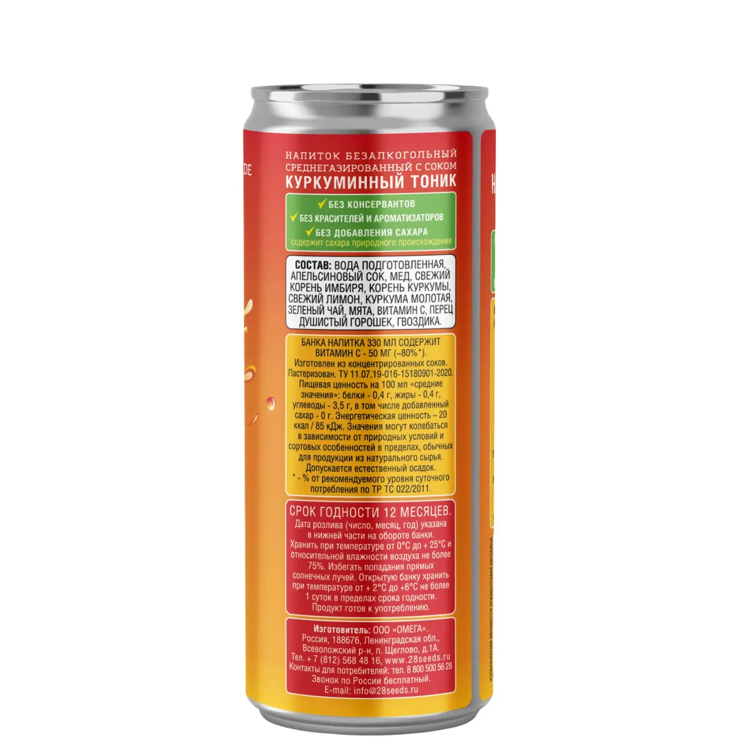28SEEDS Real TURMERIC TONIC (Куркуминный тоник) 330 мл. Вода, апельсиновый сок, мёд, свежий имбирь, корень куркумы, лимон, зелёный чай, мята, витамин C и пряности — натуральный куркуминный тоник с тёплым пряным вкусом и цитрусовой свежестью.