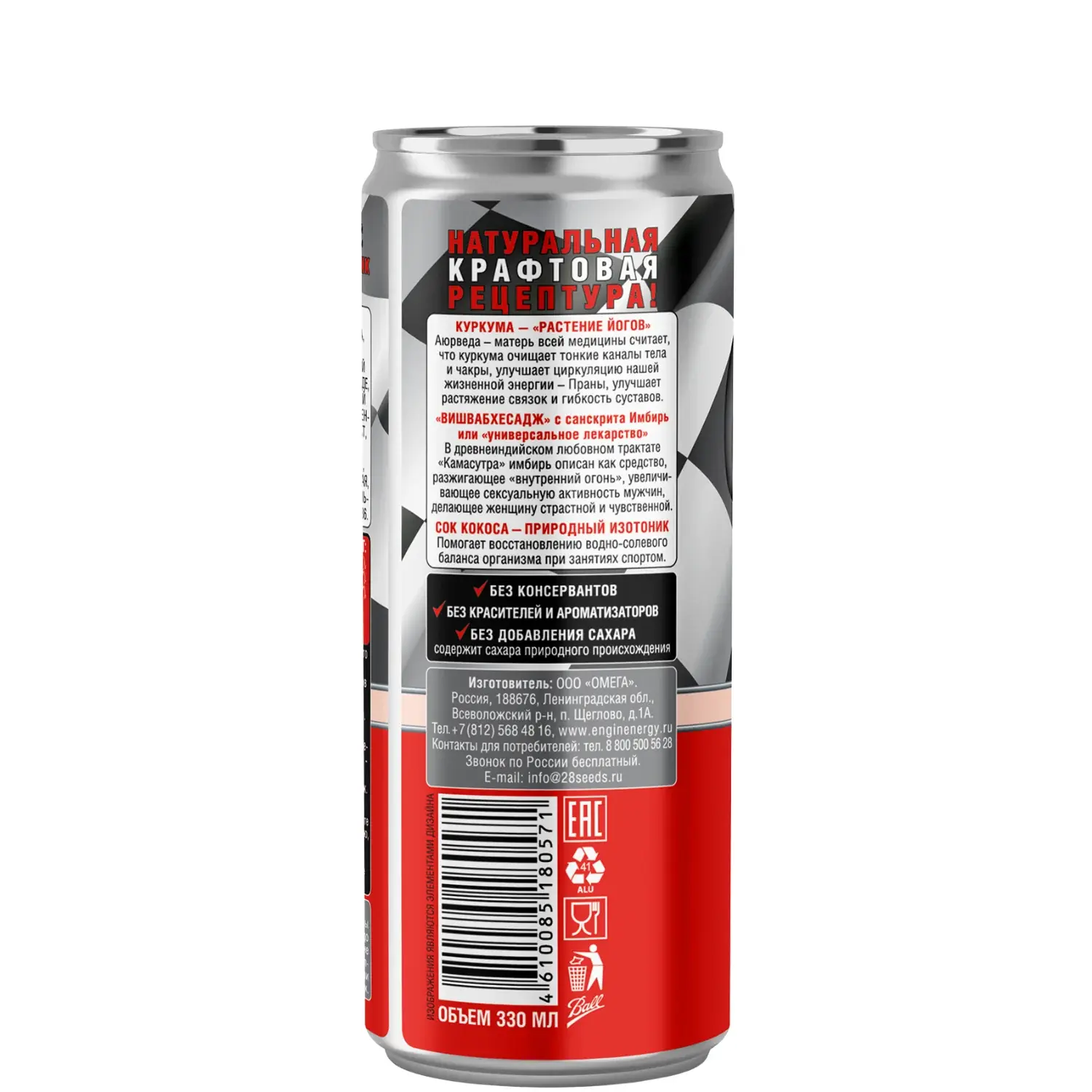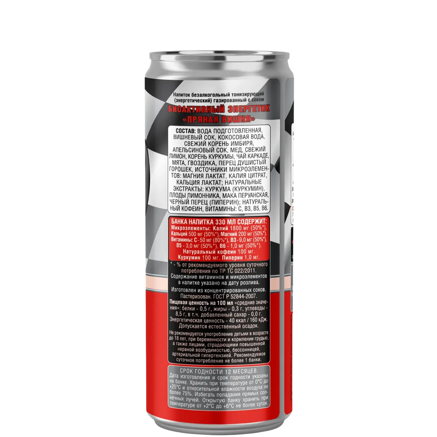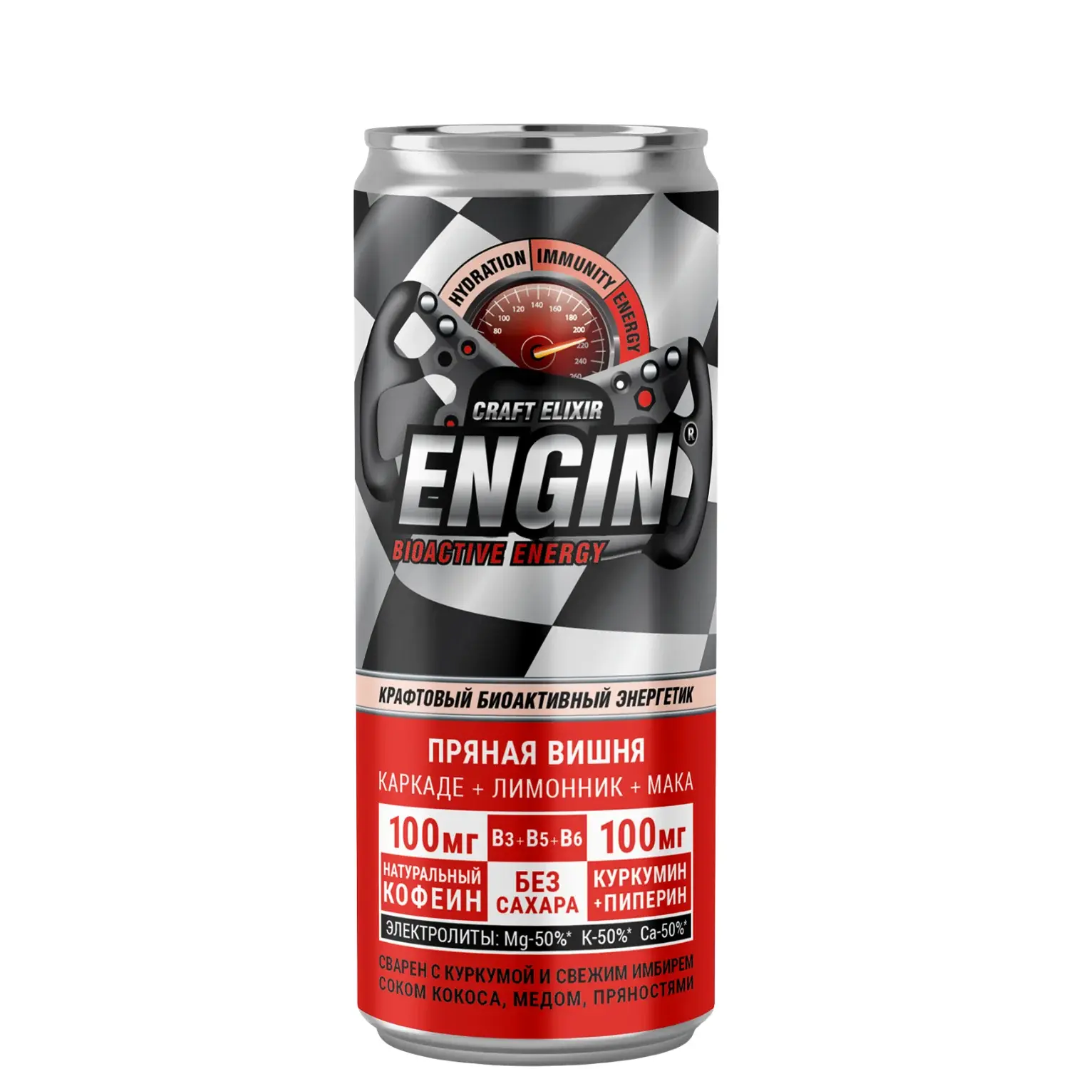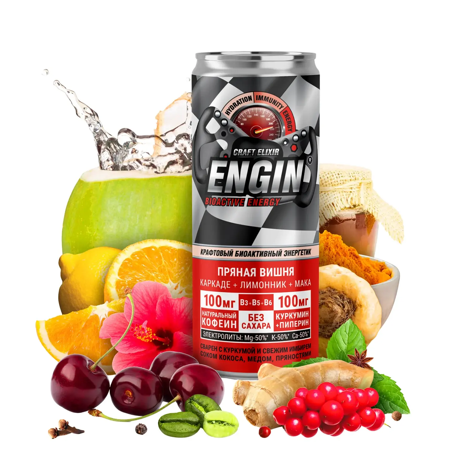 Биоактивный энергетик ENGIN «Пряная вишня» 330 мл без белого сахара. Вишнёвый сок, кокосовая вода, имбирь, мёд, лимон, куркума, лимонник, мака, натуральный кофеин и витамины — мягкая энергия и поддержка иммунитета.