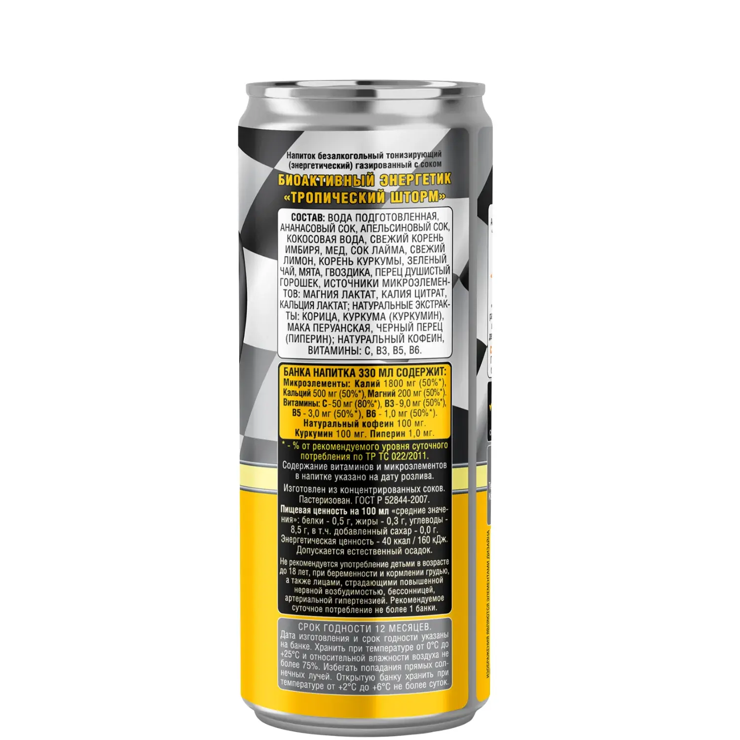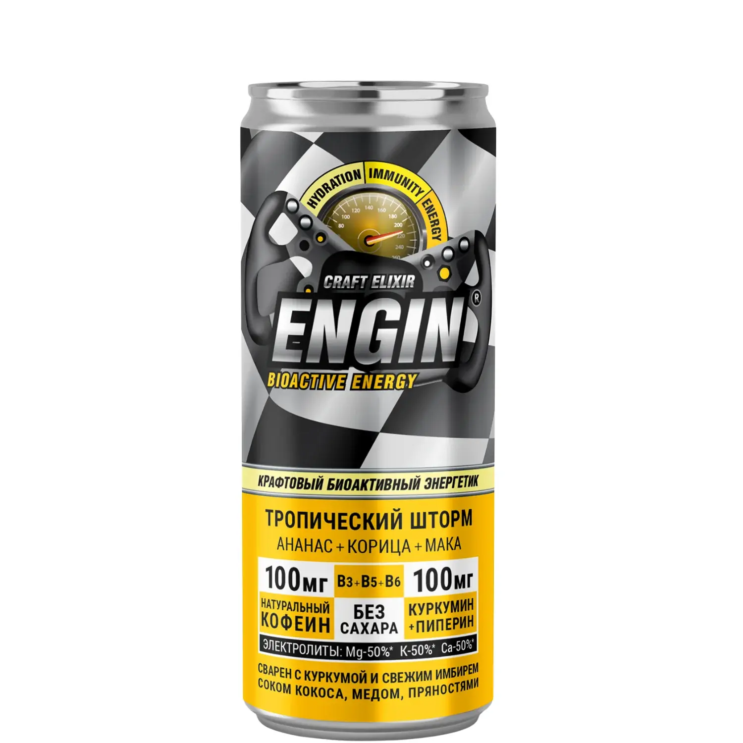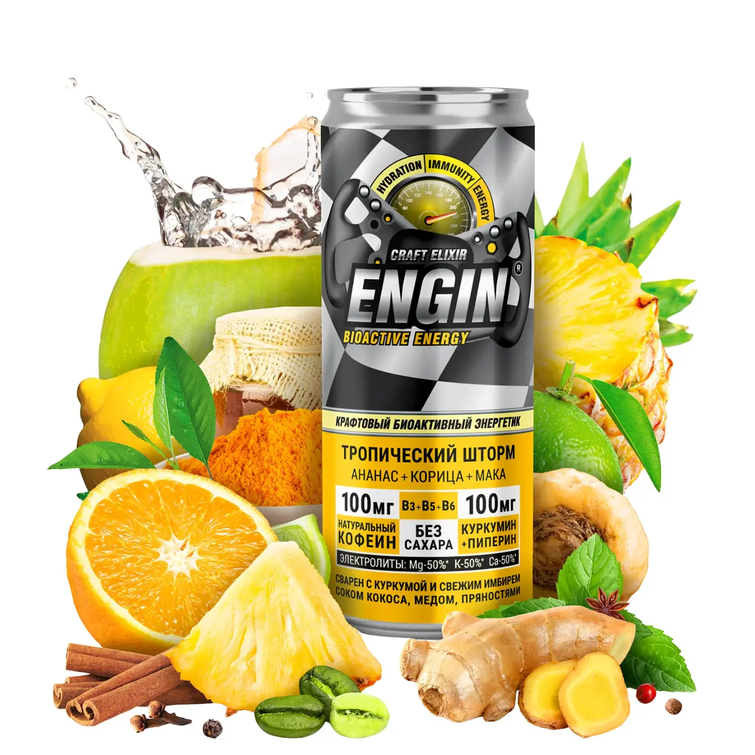 Биоактивный энергетик ENGIN «Тропический шторм» 330 мл без белого сахара. Ананасовый и апельсиновый сок, кокосовая вода, лайм, имбирь, специи, мака, натуральный кофеин и витамины — чистая тропическая энергия и поддержка выносливости.