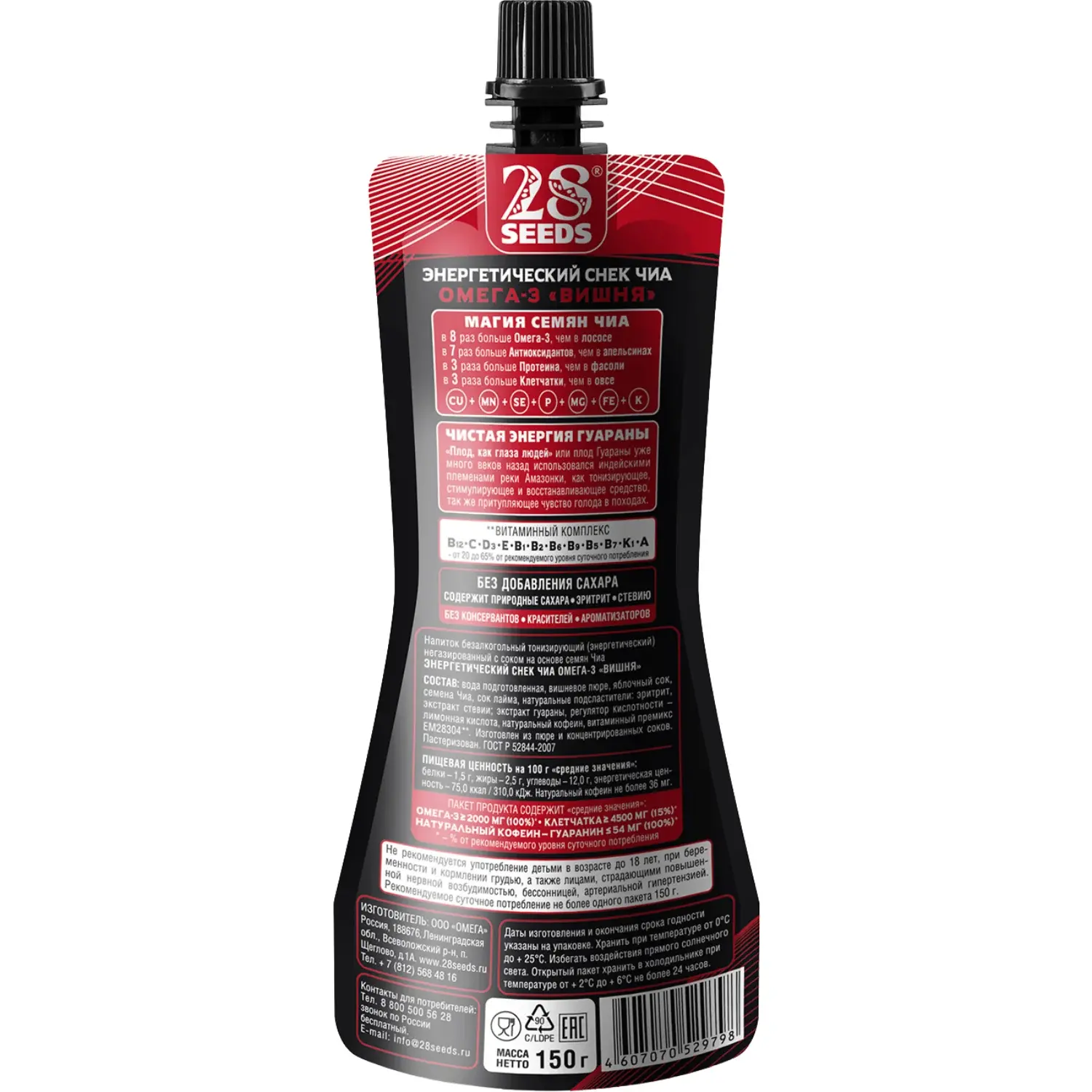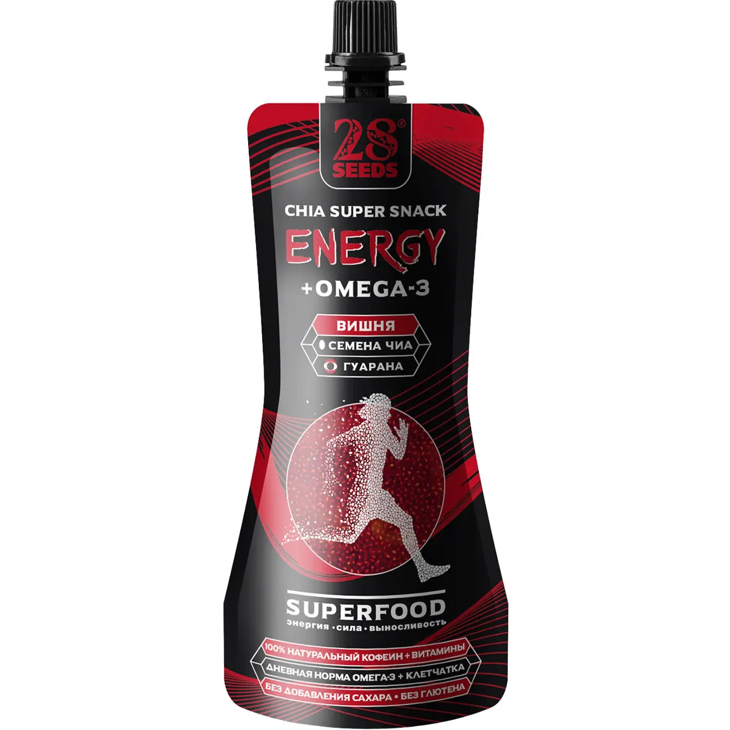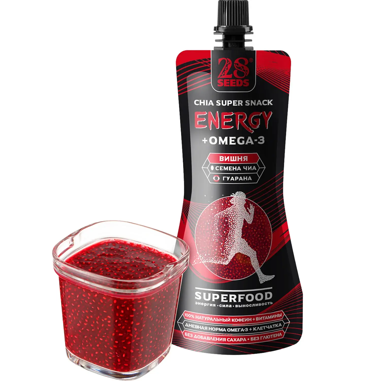 Энергетический снек Чиа ОМЕГА-3 «Вишня» 150 г без добавленного сахара. Семена чиа, вишнёвое пюре, яблочный сок, натуральные подсластители, гуарана, кофеин и витамины — ягодный энергетический перекус с Омега-3.