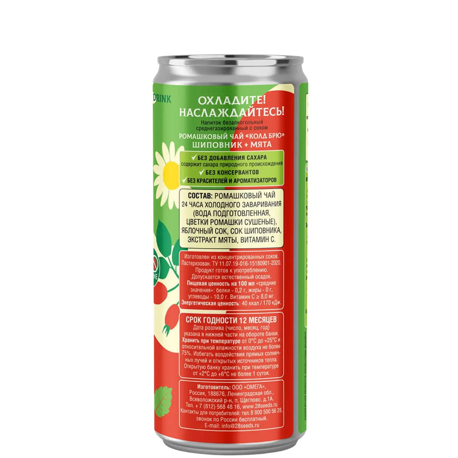 Легко газированный ромашковый чай, настоянный 24 часа по технологии cold brew, с яблочным соком, соком шиповника и экстрактом мяты. Мягкий травяной вкус с лёгкой мятной свежестью, витамин C, 40 ккал на 100 мл. Без добавленного сахара, в удобной банке 330 мл — для ЗОЖ, дня и спокойного вечера.