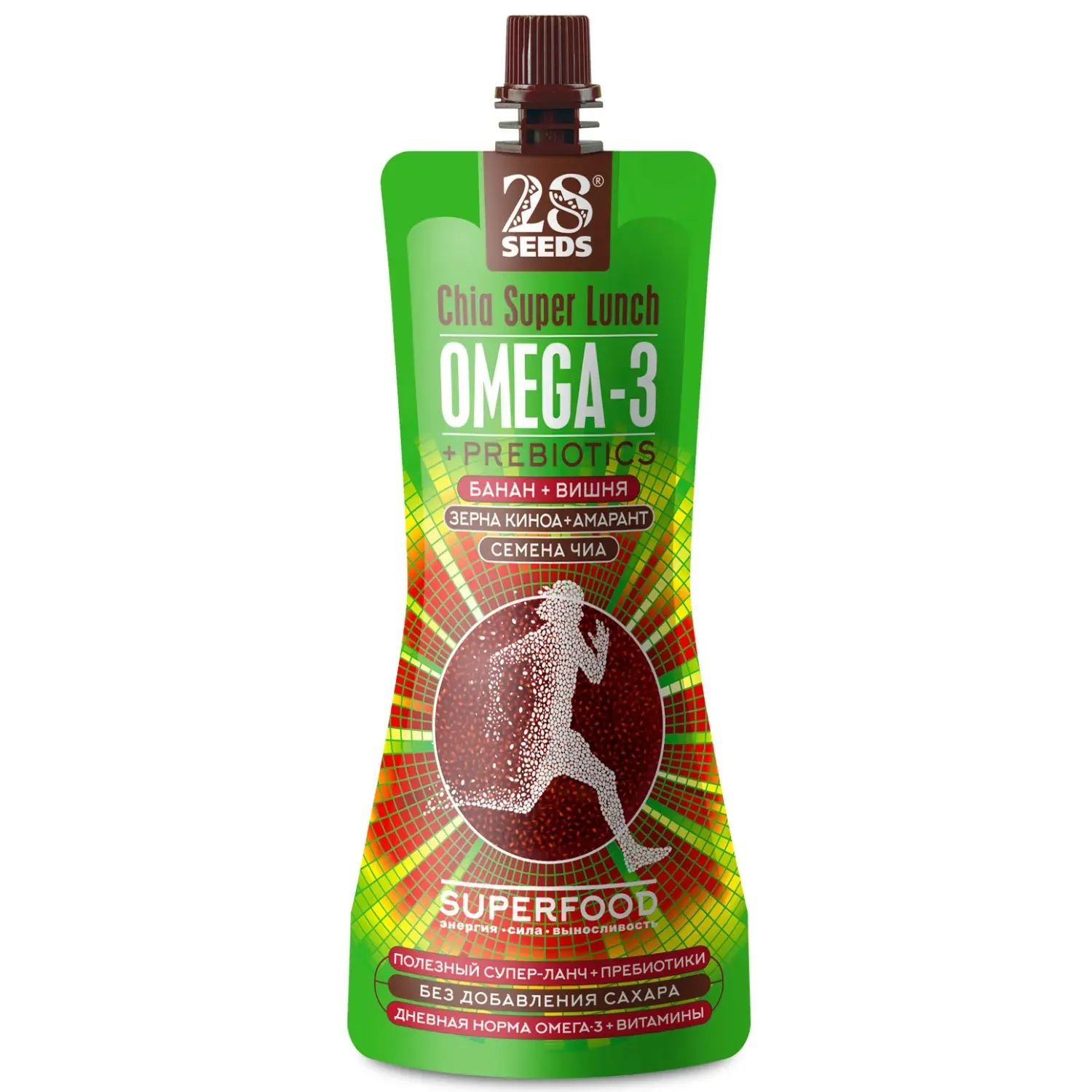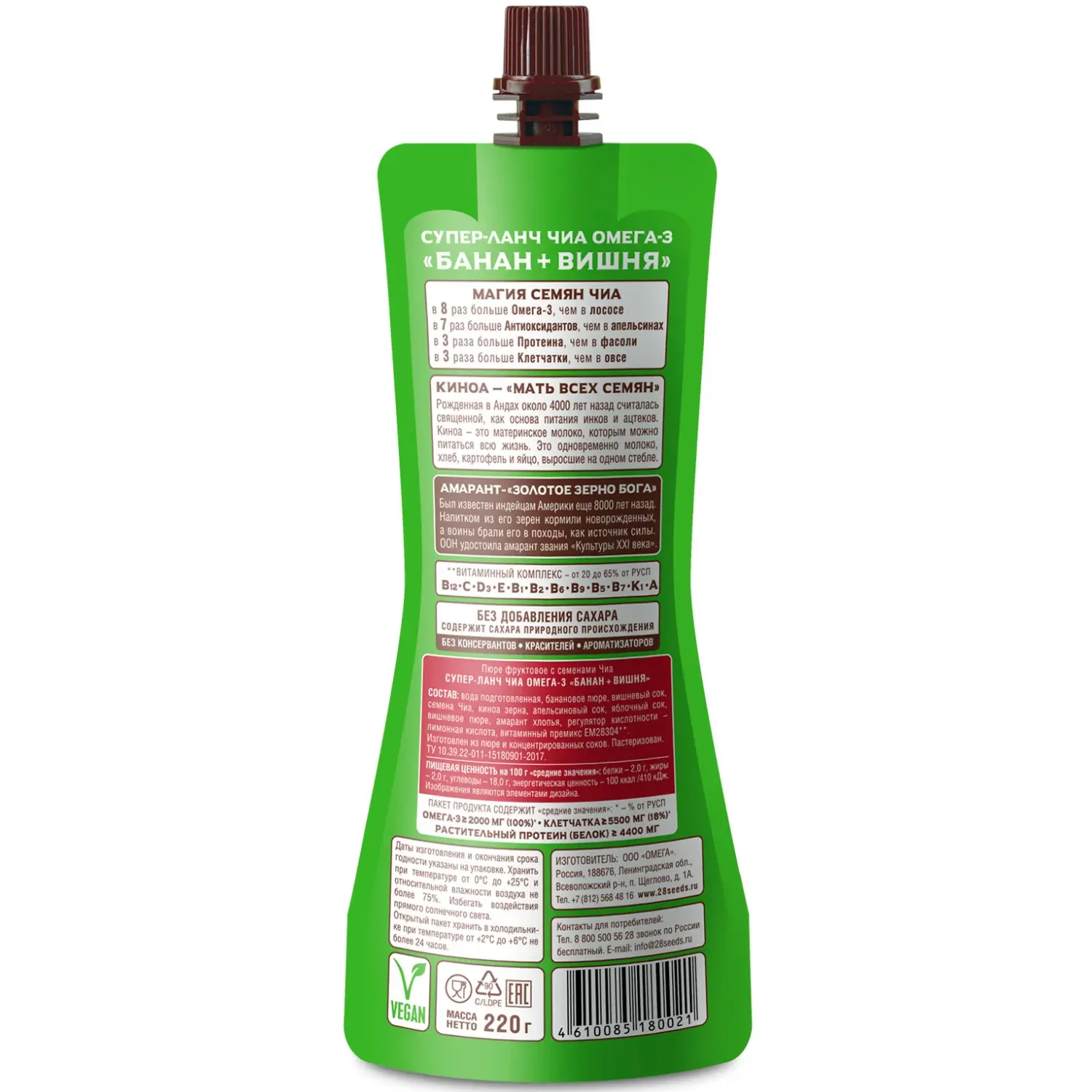 Супер-ланч Чиа ОМЕГА-3 «Банан + Вишня» 220 г. Семена чиа, банановое пюре, вишня, яблоко, апельсин, киноа и амарант — сытный фруктово-зерновой ланч с Омега-3 и витаминами.