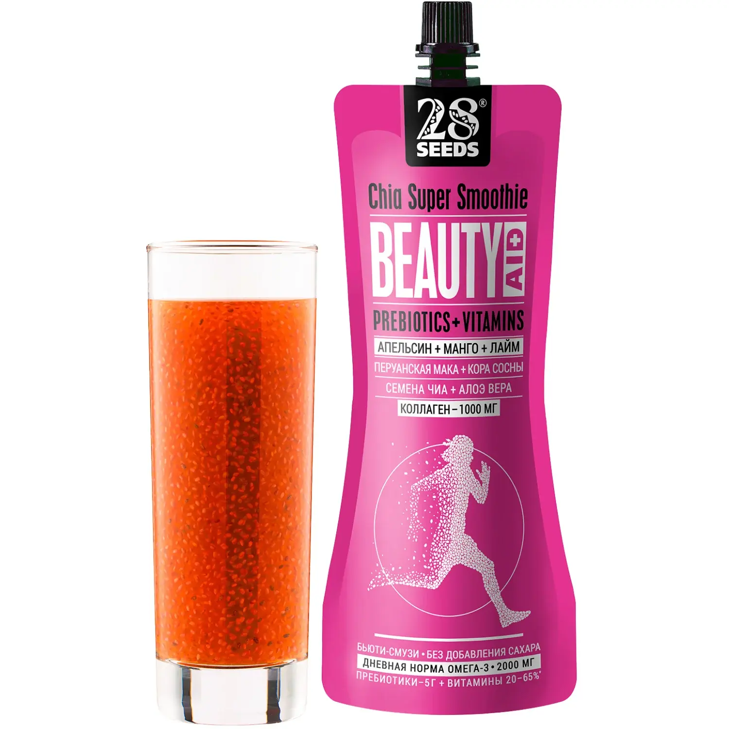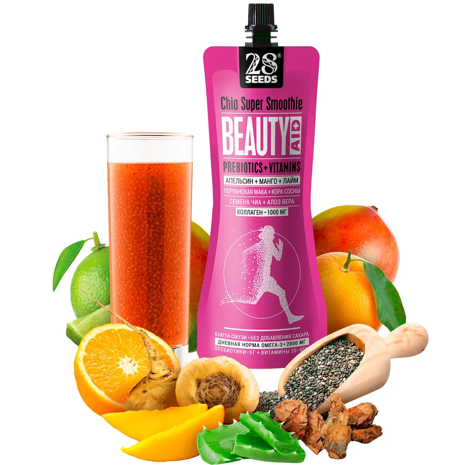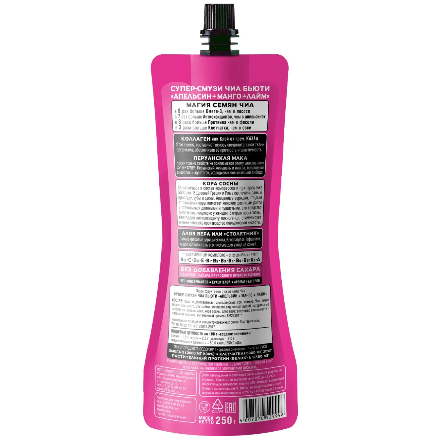 Натуральный супер-смузи Чиа БЬЮТИ «Апельсин + Манго + Лайм» 250 мл без сахара. Семена чиа, манго, апельсин, лайм, рыбий коллаген и витаминный комплекс — вкусный ритуал красоты для кожи, волос и фигуры.