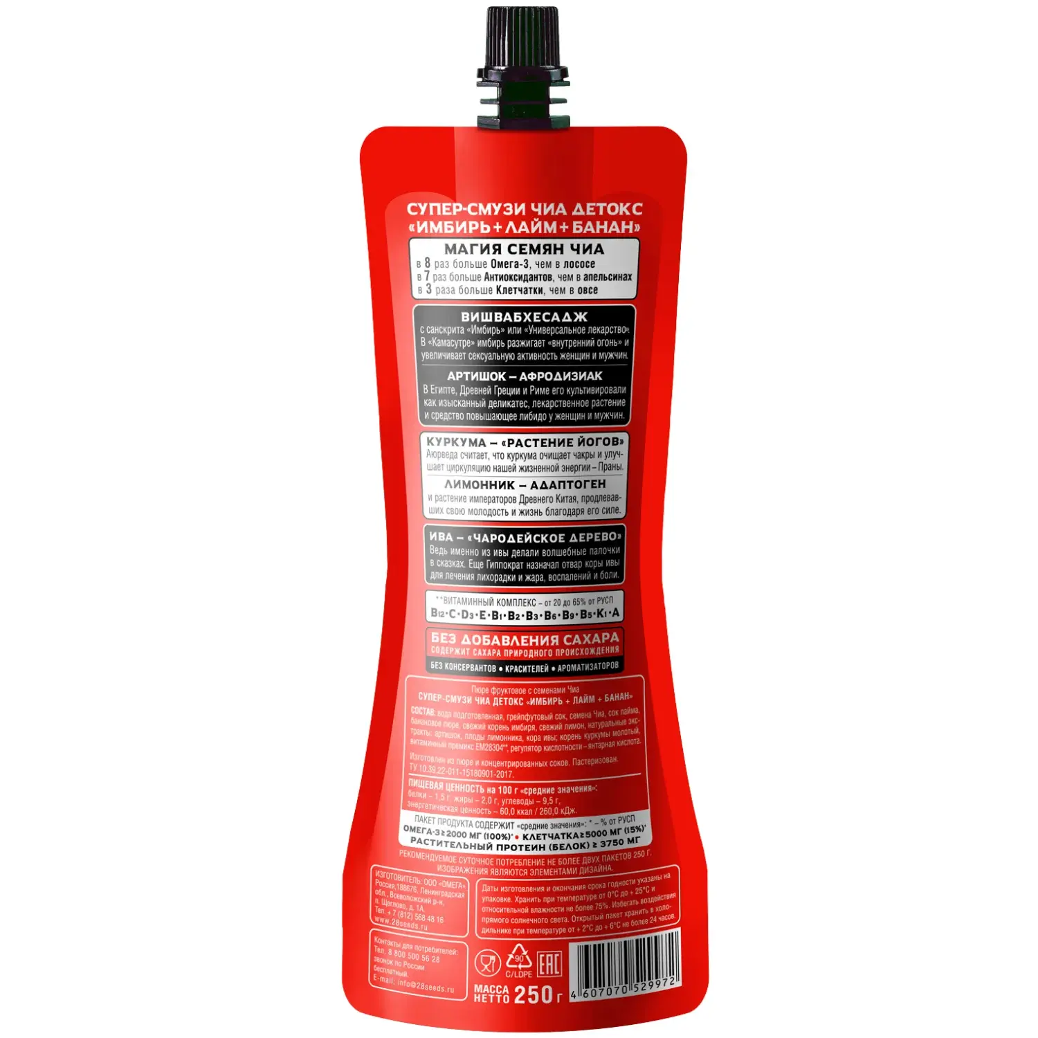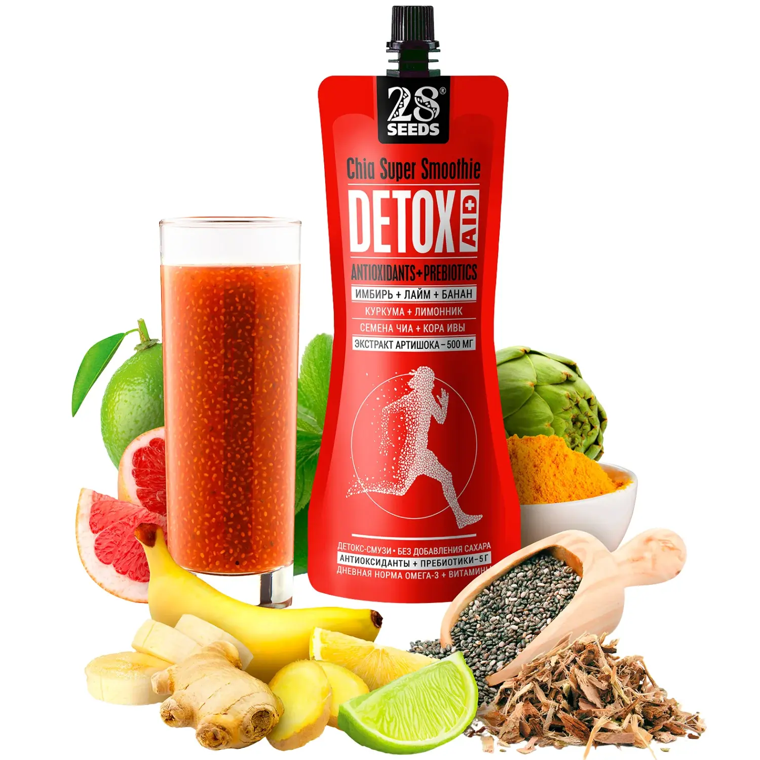 Супер-смузи Чиа ДЕТОКС «Имбирь + Лайм + Банан» 250 мл без сахара. Семена чиа, грейпфрут, лайм, банан, свежий имбирь, лимон и растительные экстракты — смузи для лёгкости и заботы о себе каждый день.