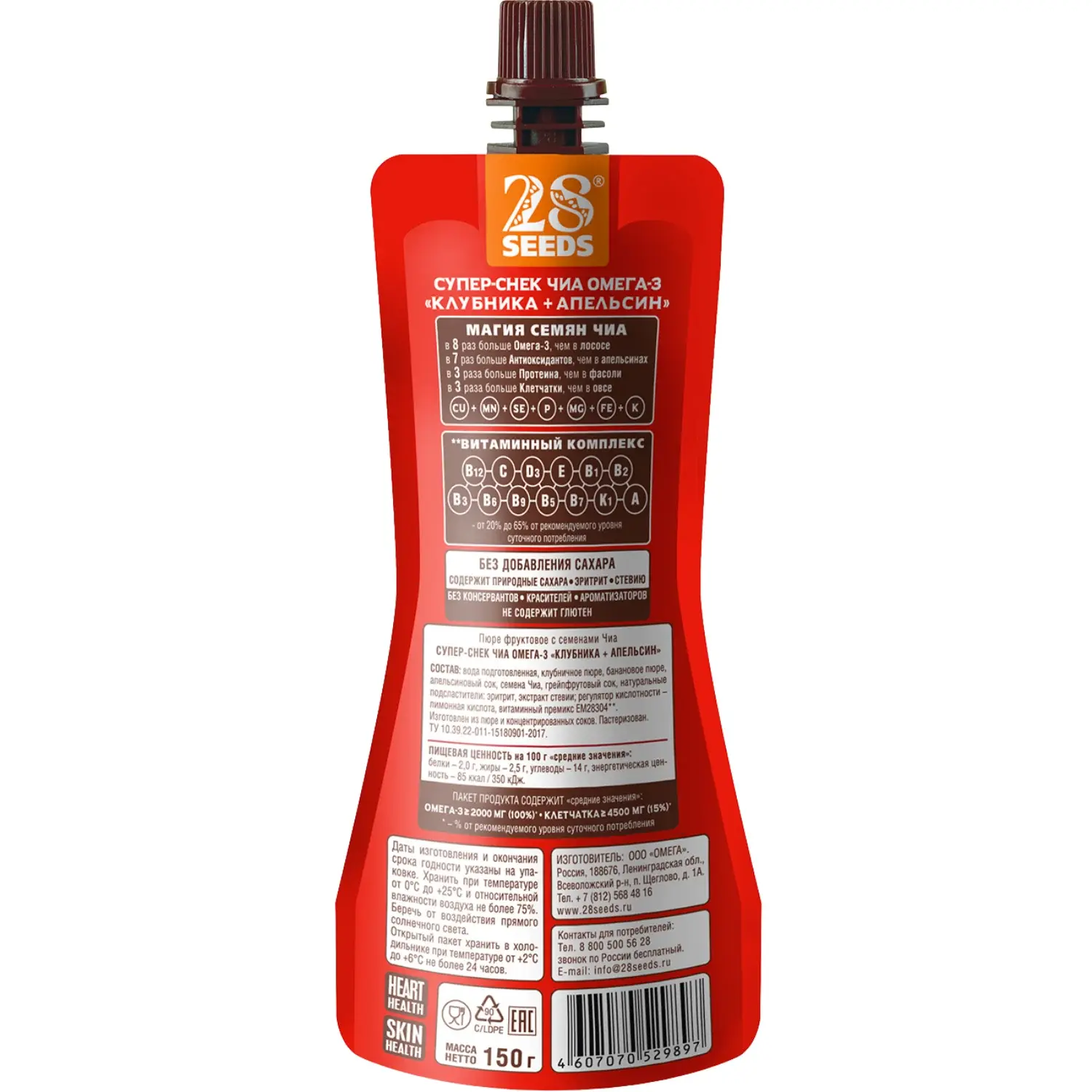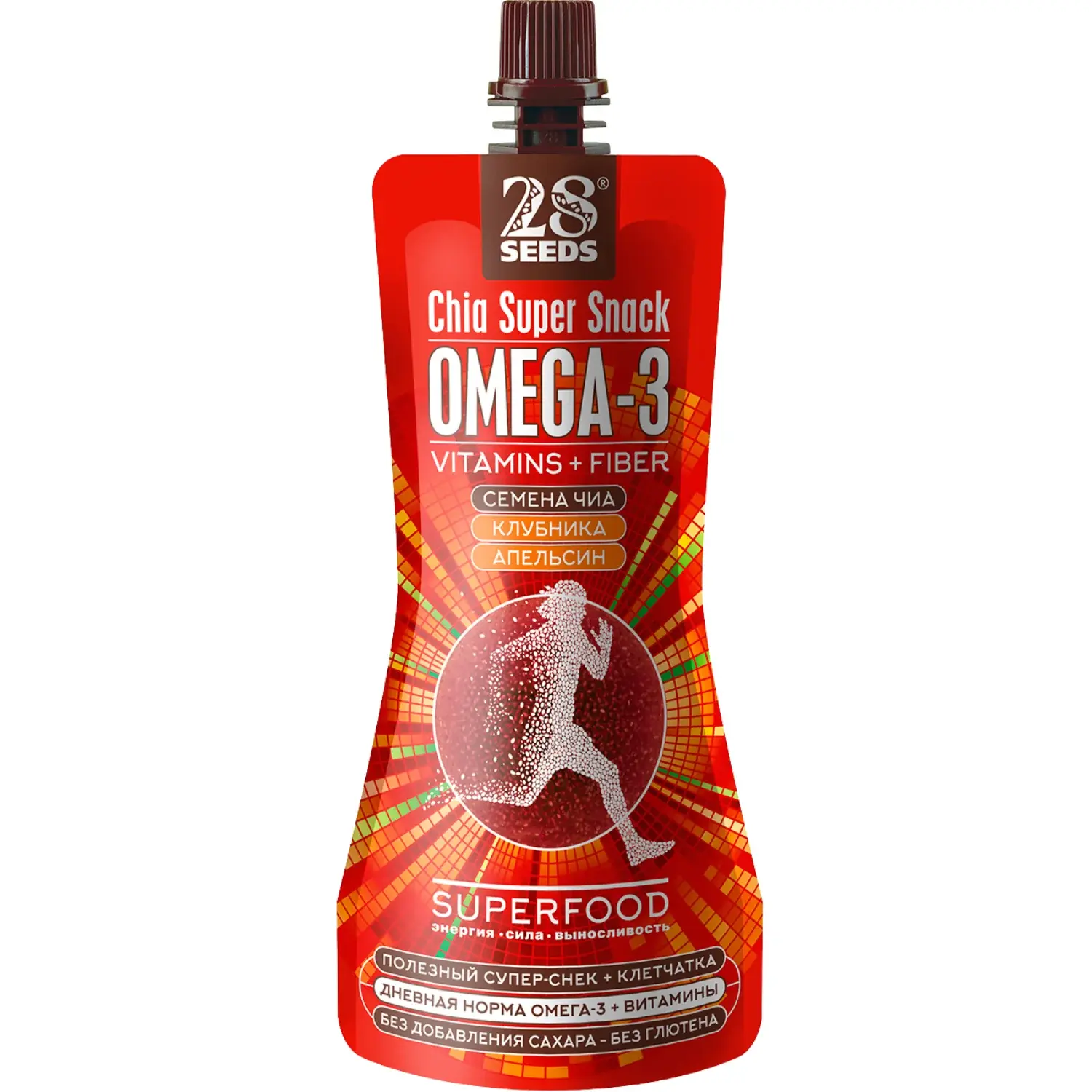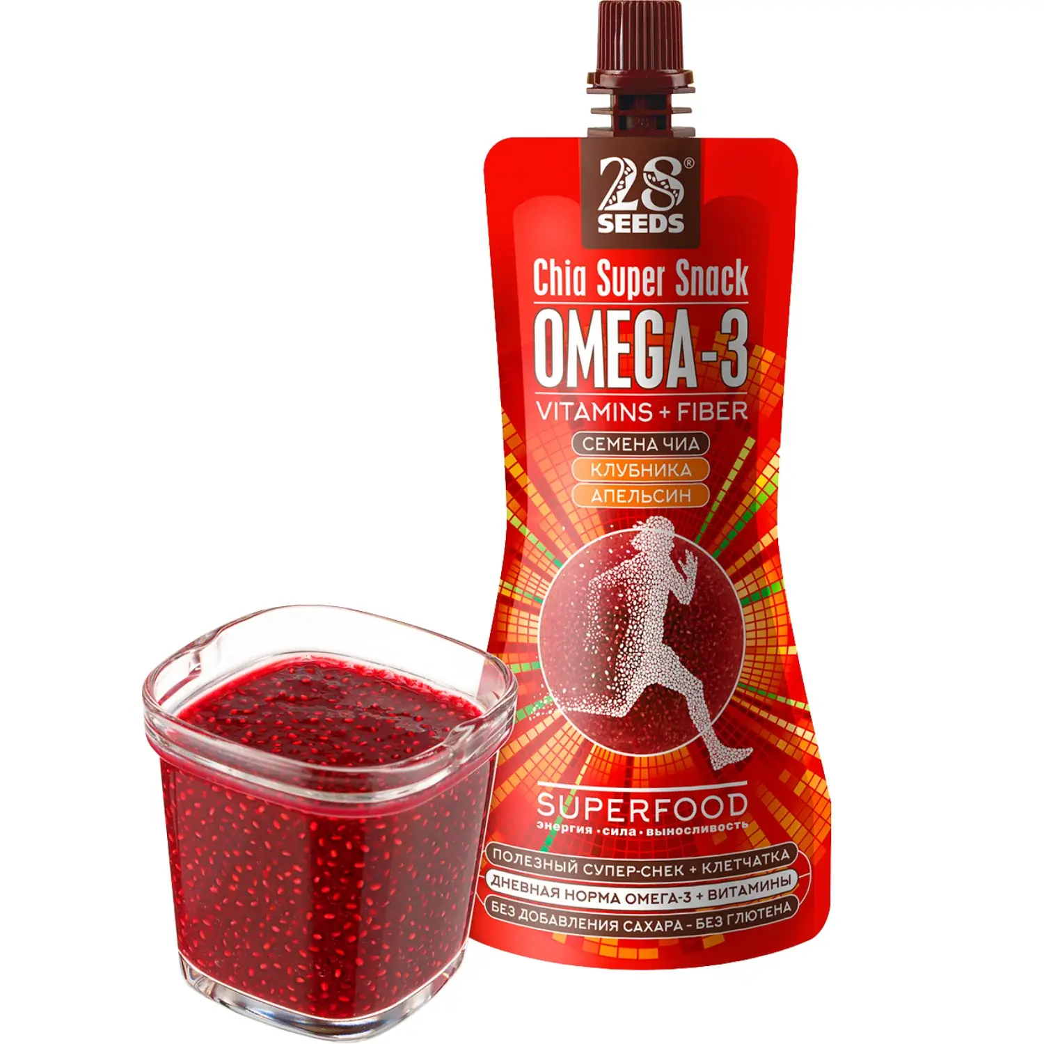 Супер-снек Чиа ОМЕГА-3 «Клубника + Апельсин» 150 г без сахара. Семена чиа, фруктовое пюре клубники и банана, апельсиновый и грейпфрутовый соки, натуральные подсластители и витамины — удобный полезный перекус с Омега-3.