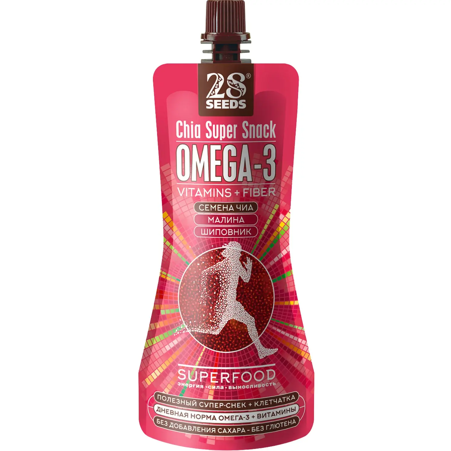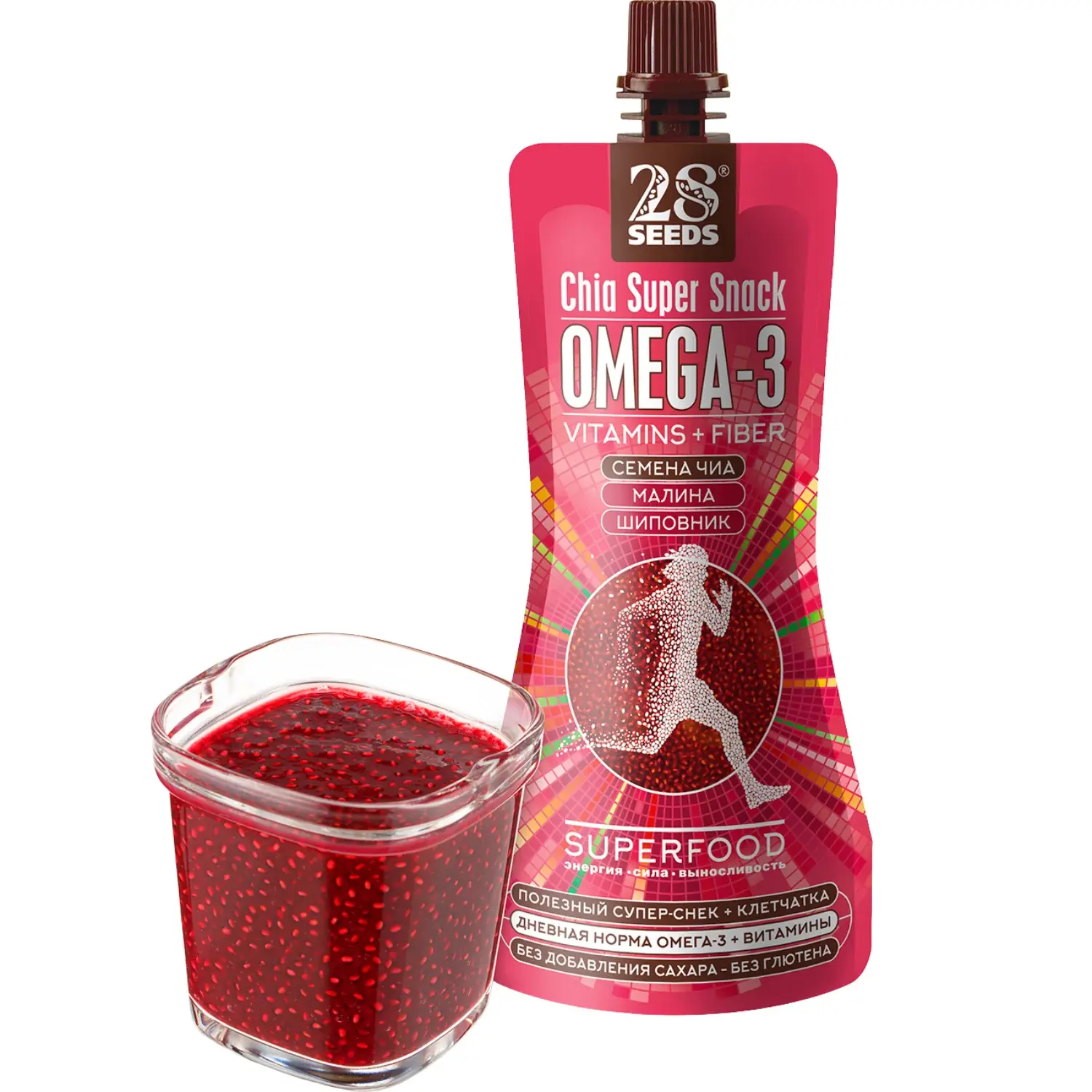 Супер-снек Чиа ОМЕГА-3 «Малина + Шиповник» 150 г без добавленного сахара. Семена чиа, малиновое пюре, сок шиповника и яблочный сок — ягодный десерт с Омега-3, витаминами и натуральными подсластителями.