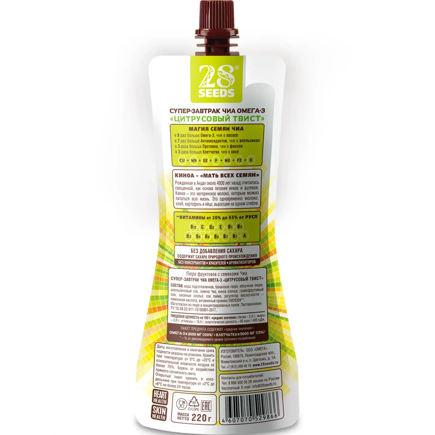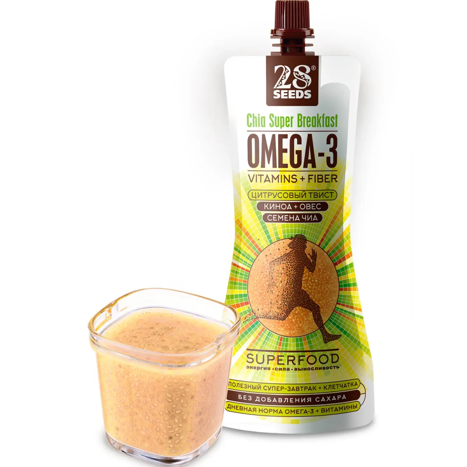Супер-завтрак Чиа ОМЕГА-3 «Цитрусовый твист» 220 г. Семена чиа, банан, яблоко, апельсин, грейпфрут, лайм, овсяные и киноа хлопья, витамины и Омега-3 — готовый полезный завтрак с ярким цитрусовым вкусом.