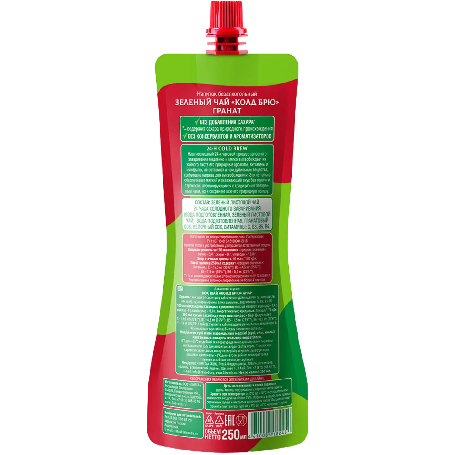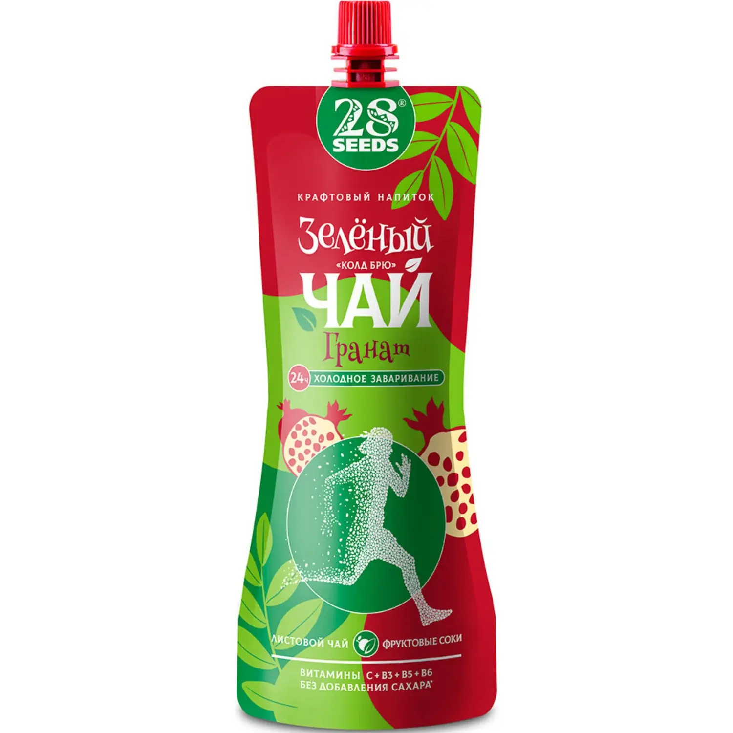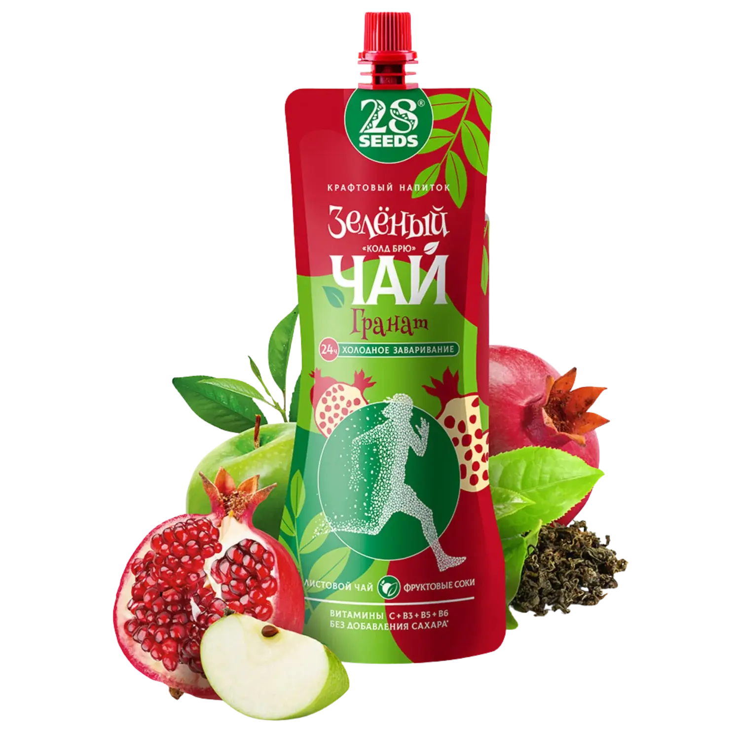 Холодный зеленый чай, настоянный 24 часа по технологии cold brew, с гранатовым и яблочным соком. Негазированный напиток без добавленного сахара, с витаминами C, B3, B5, B6. Яркий гранатовый вкус для ЗОЖ-рациона, обеденного стола, офиса и поездок.