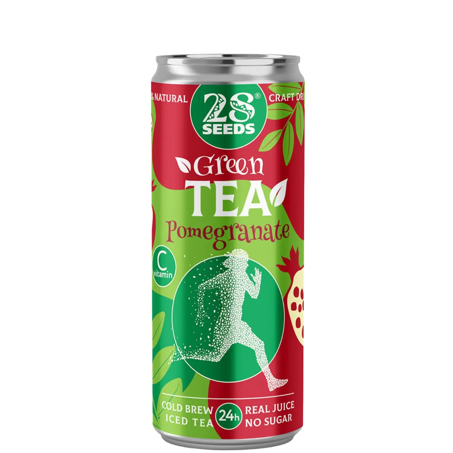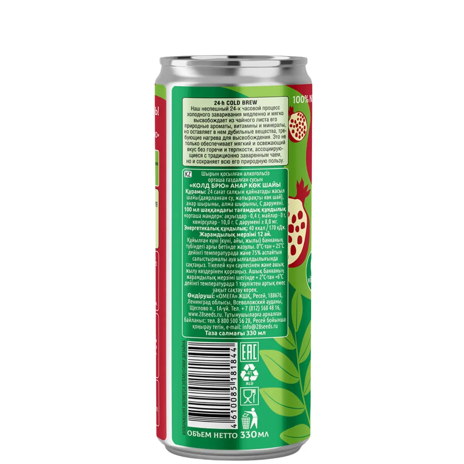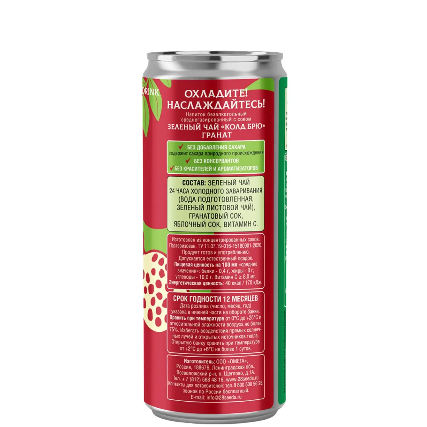 Слабогазированный зеленый чай cold brew с гранатовым и яблочным соками. Яркий фруктовый вкус, 24-часовое холодное заваривание, витамин C, 40 ккал на 100 мл. Без добавленного сахара, банка 330 мл.