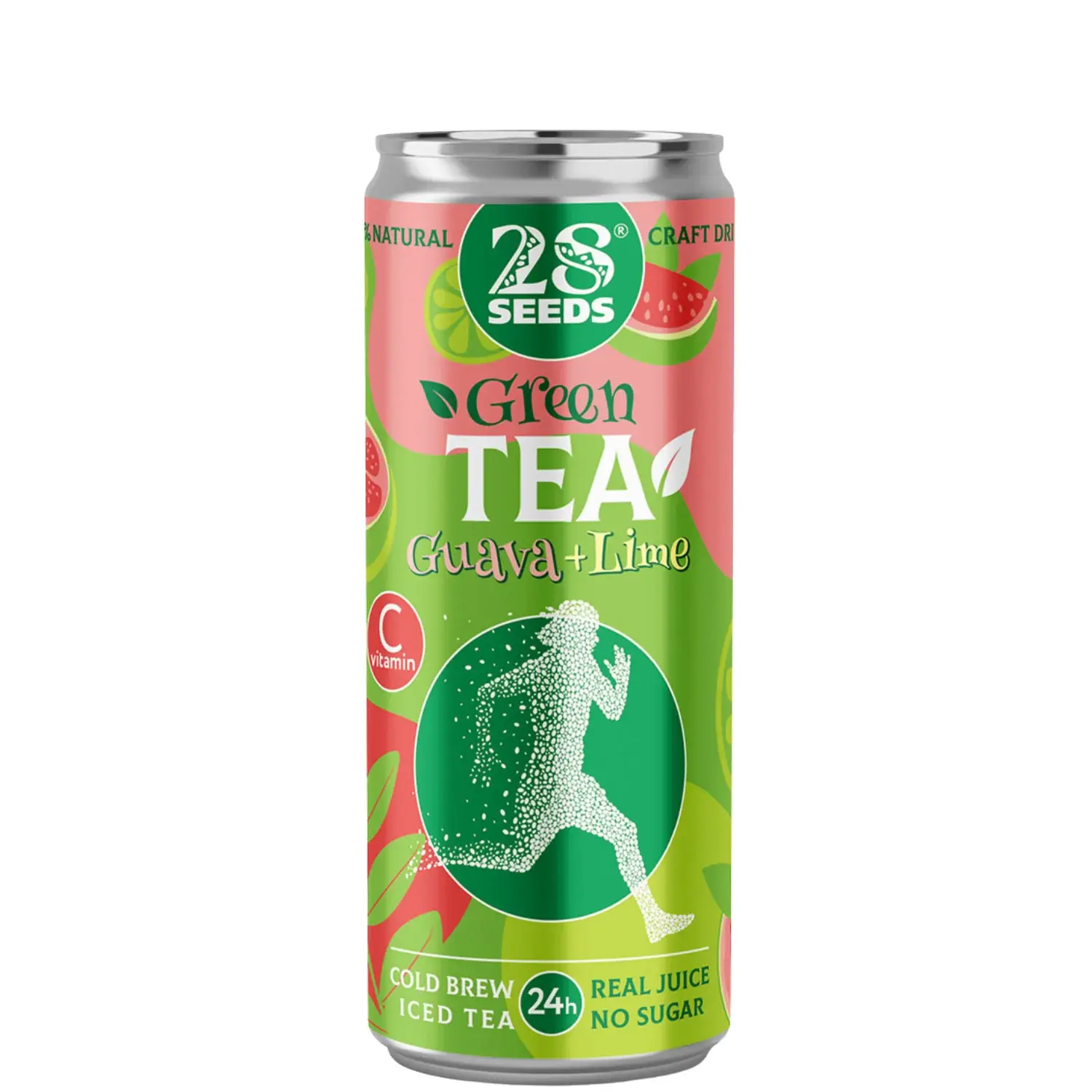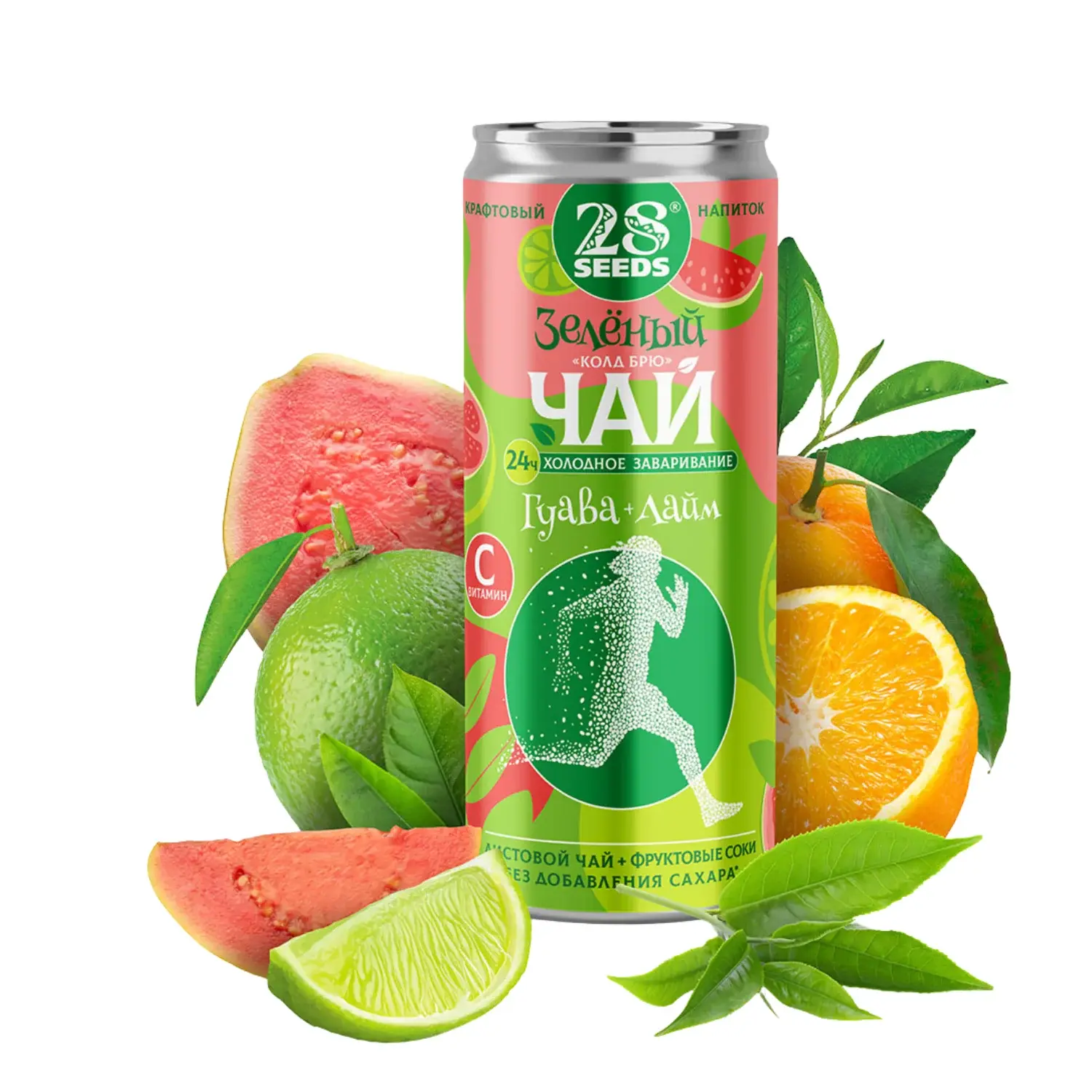 Газированный зеленый чай cold brew с соком гуавы, лайма и апельсина. 24-часовое холодное заваривание, витамин C, 30 ккал на 100 мл. Освежающий тропико-цитрусовый вкус без добавленного сахара, банка 330 мл.